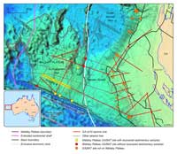 Swath bathymetry collected during Marine Reconnaissance (GA-2476) survey imaged the plateau with the highest resolution and greatest coverage to date. It has enabled identification and mapping of both large bathymetric features including newly named seamounts (Wallaby and Cuvier Seamounts) and smaller features like asymmetric ridges within Wallaby Zenith Fracture Zone and a linear rift valley across the Plateau (Daniell et al., 2010). The new seismic data enabled more detailed mapping of the main structural elements, inclding assessment of the thickness and distribution of stratified reflector sequences.