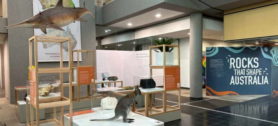 The Rocks That Shape Australia exhibition in the foyer of the Geoscience Australia Symonston Building in Canberra. (Image: Geoscience Australia)