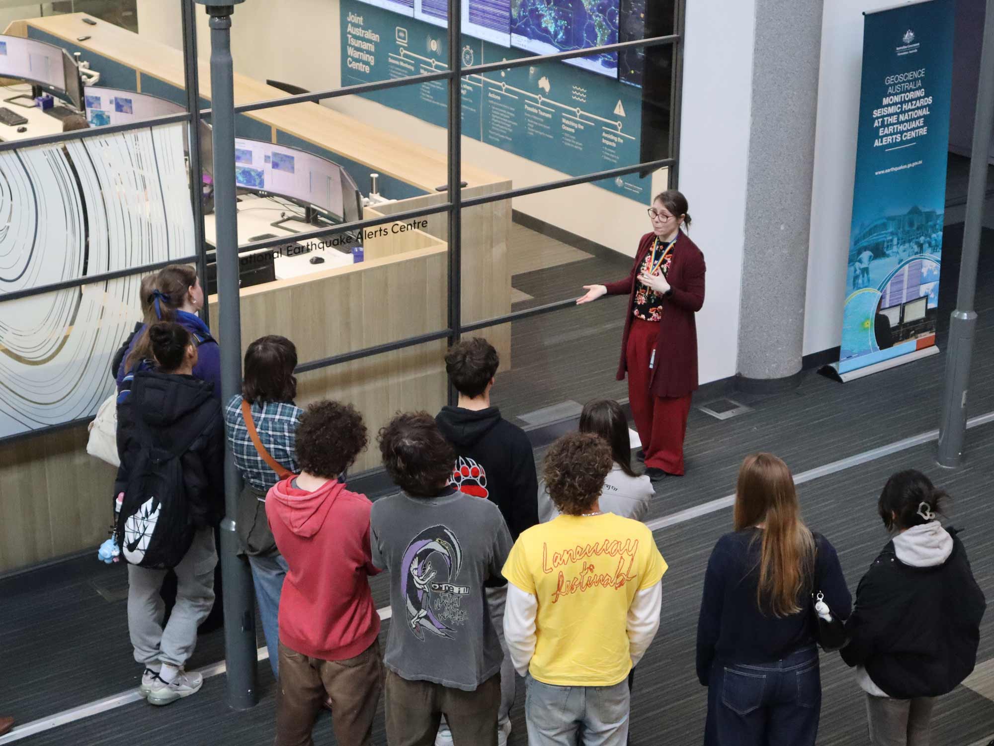 Tamara Alden explaining how the scientists in the National Earthquake Alerts Centre, which operates 24/7 from Geoscience Australia’s headquarters, provides near real time data to other parts of government when an earthquake occurs (Image: Geoscience Australia)