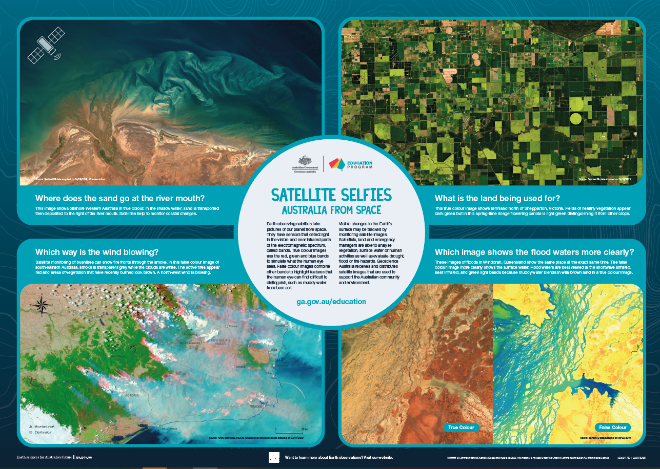 Our ‘Satellite Selfies’ poster is a great resource with striking examples of satellite imagery from across Australia, demonstrating how we track natural hazards and monitor environmental changes.
