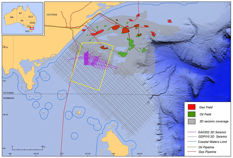 The project focused on the CO2 storage potential of the underexplored southernmost part of the Central Deep, Southern Terrace and Southern Platform areas within the basin. A pre-competitive 2D reflection seismic survey, GA0352, was acquired in the southern part of the basin in 2015 as part of the project to provide new data to support future CO2 storage activities. The seismic survey was designed to tie the existing extensive 3D seismic coverage in the central part of the basin to the southern part of the basin, so seismic lines were shot perpendicular to the main structural trend of the basin. The survey has improved seismic data density in an area with widely-spaced seismic lines that were acquired in 2010 as part of the VicGCS program. Bathymetric data was also acquired during the survey.