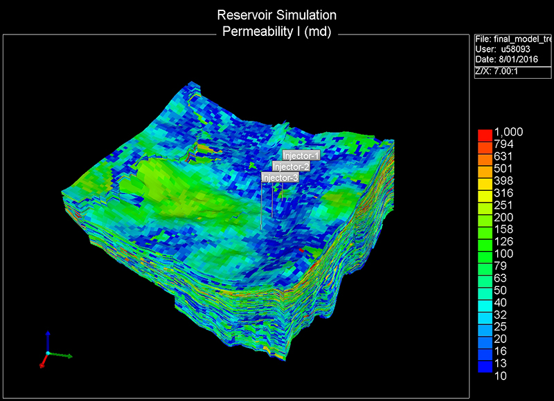 Horizontal permeability values (scale in millidarcies; logarithmic scale) in the upper Latrobe Group reservoir simulation model.