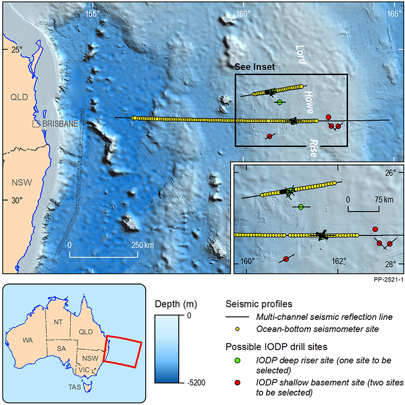JAMSTEC and Geoscience Australia, together with participants from the University of Sydney and GNS Science (New Zealand), successfully completed the first of two pre-drilling site surveys on 11 May 2016. This seven-week survey acquired 2D seismic reflection data and seismic refraction data, recorded by 100 ocean-bottom seismometers, along an east-west transect across the LHR to map regional crustal structure (Figure 1).