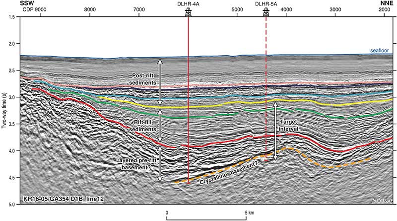 Figure 2. Example of processed seismic reflection data from the 2016 Deep Seismic Survey showing inferred geology and potential sites for deep stratigraphic drilling
