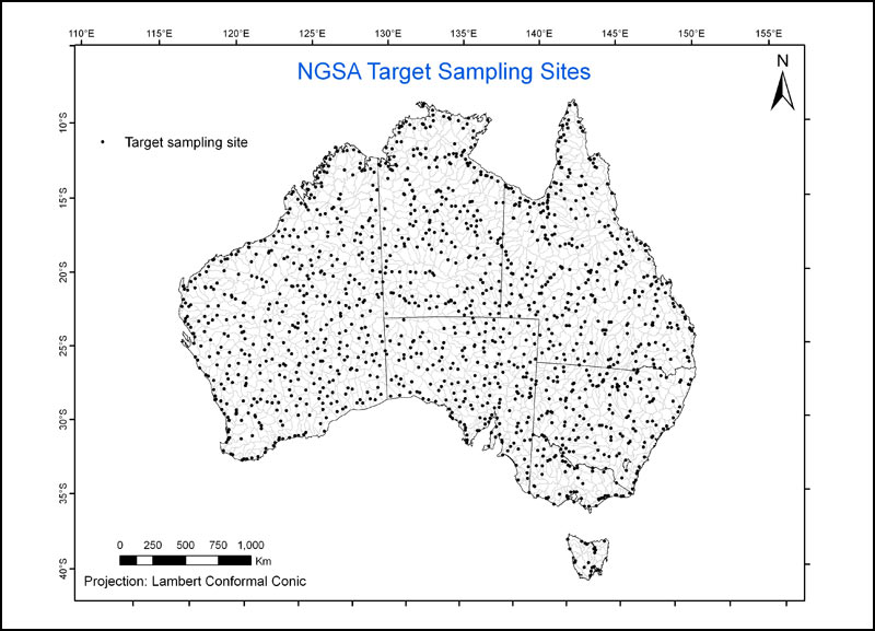 A sampling method has been adapted to Australian landscapes and climate conditions. It has been field-tested in the Riverina, Gawler and Thomson pilot projects. The cost of a national survey is kept reasonably low by applying an ultra low sampling density approach (1 site/1000 square kilometres to 1 site/10 000 square kilometres).