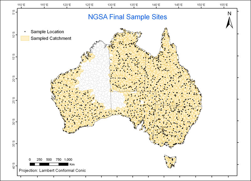 - Timeline: Following planning in the first half of 2007, fieldwork, including initial training, began in mid 2007 and ran until late 2009. Figure 6 shows the final distribution of sampled catchments. Of the 1390 targeted catchments, 1186 could be accessed in time, yielding approximately 80 per cent coverage of the nation. Including six large catchments which were subject to additional sampling higher up in the landscape and 123 sampled in duplicate for quality control, the NGSA project has collected samples at 1315 sites across the continent. Sample preparation started in late 2007 and concluded at the end of 2009. Sample analysis began in late 2008 and concluded in mid 2010. Data analysis and reporting are taking place during 2010-11 prior to the project's conclusion on 30 June 2011.