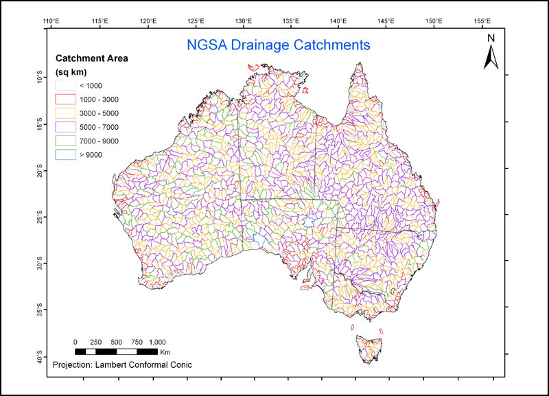 - Sampling sites: 1390 catchments covering 91 per cent (or about seven million square kilometres) of Australia across all States and Territories were targeted for sampling (Figure 3). Most catchments were sampled near their outlet, while those exhibiting internal or poorly defined drainage were sampled at, or as close as possible to, their lowest point. Catchments smaller than 1000 square kilometres (mostly coastal) and small islands were not included in the survey. The resulting distribution of catchment outlet sites targeted for sampling is shown in Figure 4 and translates to an average sampling density of around 1 site/5500 square kilometres.