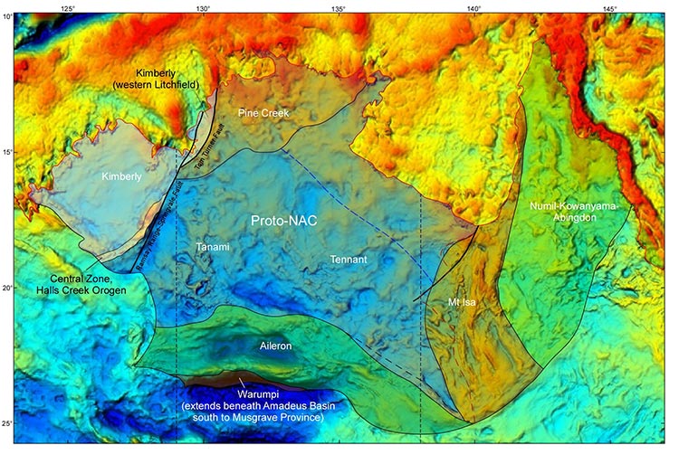 When the North Australia Project was initiated in 2000, the North Australian Craton (NAC) was one of the least understood megaelements recognised in the Australian Crustal Elements Map (Figure 1), interpreted at that time to be bounded in the south by a continental-scale magnetic anomaly (Figure 2). This megaelement included mostly Paleoproterozoic basement blocks and extended east from the Kimberley Block to North Queensland, incorporating the Pine Creek Orogen, the Tanami region, and the Arnhem, Tennant and Murphy Inliers in the Northern Territory. Although the Arunta region lies largely to the south of the magnetic anomaly, it contains rock successions (e.g. Lander Rock beds) of broadly similar age and lithology to those in the Tanami Region. The younger history of the combined North Australian Craton-Arunta region (or the North Australian Craton) is dominated by the deposition of Proterozoic superbasin sequences, including the MacArthur and Victoria-Birrindudu Basins, which have been the focus of studies under the North Australian Basins Resource Evaluation (NABRE) project, and the Neoproterozoic to Paleozoic Georgina and Amadeus Basins.
