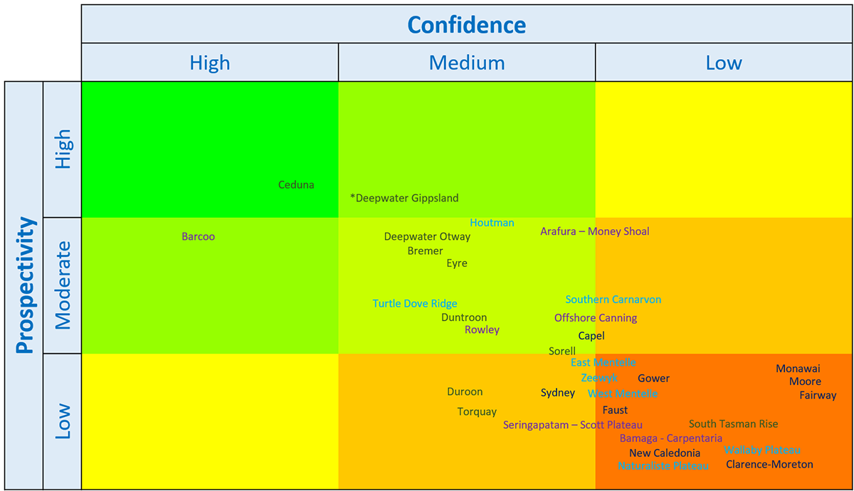 Prospectivity/Confidence Matrix for Australia's Offshore Frontier Basins. As at January 2022. * indicates conceptual frontier.