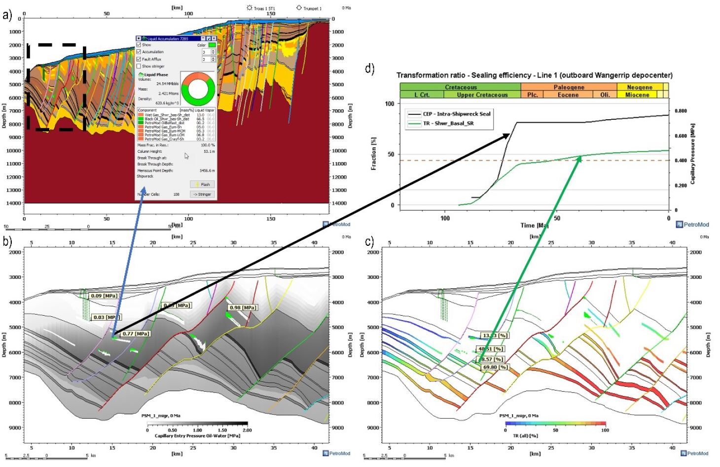 Figure 5. Predicted accumulation in the outboard Morum Sub-basin: a) modelled section b) predicted sealing efficiency c) transformation ratio of source rocks d) timing relationship of transformation ratio and sealing efficiency (Schenk et al., 2023).