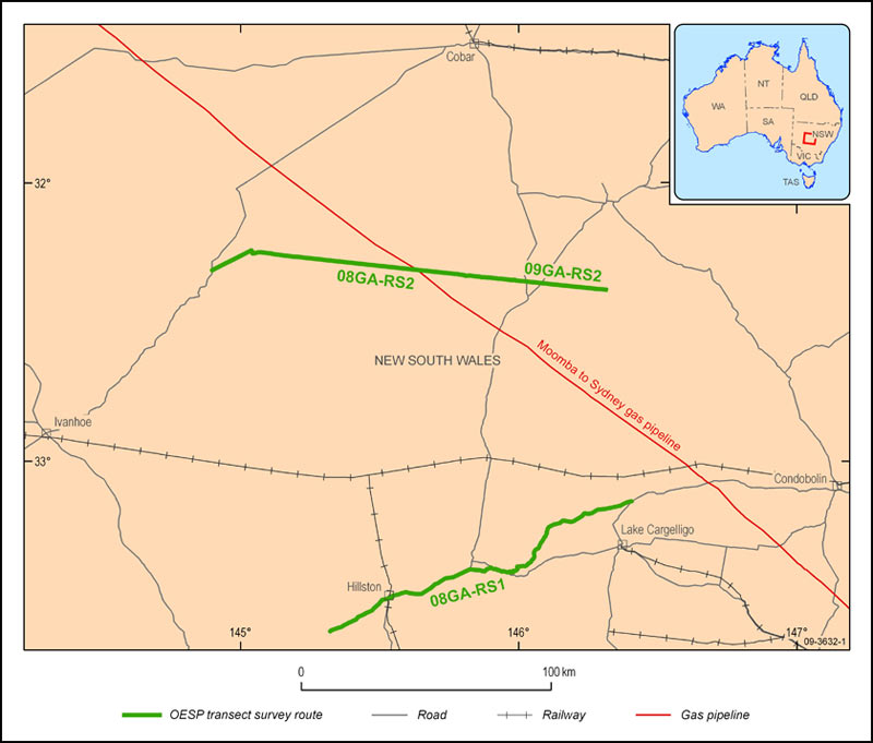 The Rankins Springs-Yathong Trough Seismic Survey was the first survey of an under-explored onshore petroleum basin undertaken as part of the OESP. The deep seismic survey comprised two east-west traverse lines, one each across the Rankins Springs and Yathong Troughs in the southeastern Darling Basin in western New South Wales (see Figure 13). The survey acquired a total of 234 kilometres of seismic data in March 2008.