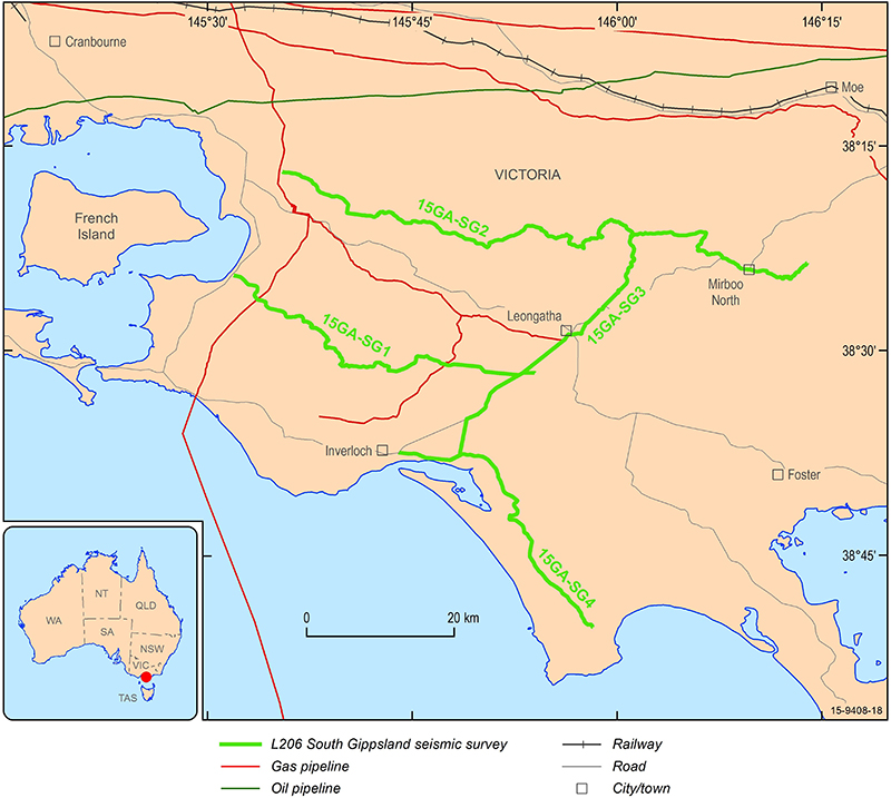 2D seismic reflection data were acquired in the South Gippsland region of Victoria in June-July 2015. The project was a collaboration between the Geological Survey of Victoria and Geoscience Australia. The purpose of the survey was to gain an understanding of the geometry and internal structure of the Cretaceous Strzelecki Group and the underlying Palaeozoic basement of the Melbourne Zone. Two hundred and three km of deep crustal reflection data were collected for the South Gippsland seismic survey along four transects 15GA-SG1, 15GA-SG2, 15GA-SG3 and 15GA-SG4. Raw data are available on request from clientservices@ga.gov.au