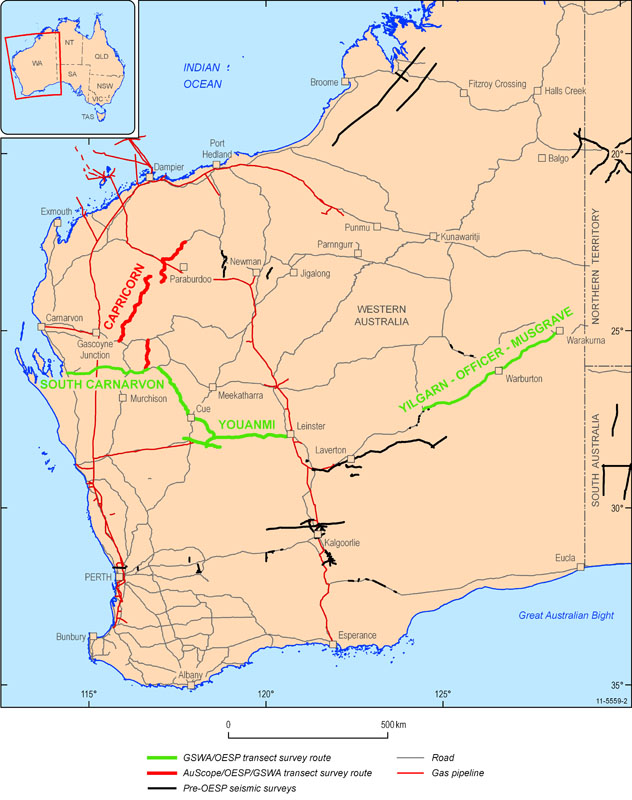 In June and July 2011, 487km of seismic reflection, gravity, MT and wide angle refraction data were acquired over the western Officer Basin, another of Australia's under-explored sedimentary basins with hydrocarbon potential. The survey data will build on the geoscientific knowledge of the architecture of Australia's crust and the relationship with the western Yilgarn and central Musgrave cratons and the overlying Officer Basin (see Figure 9). Final processed data and images were released in January 2013.