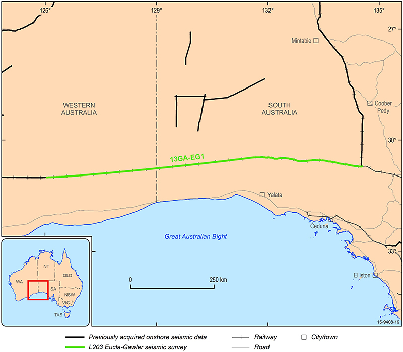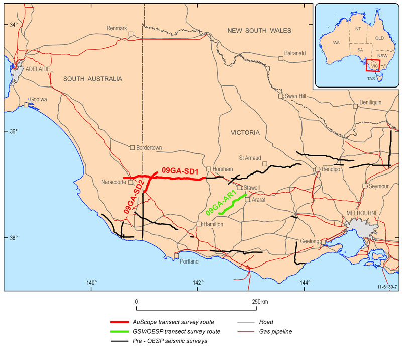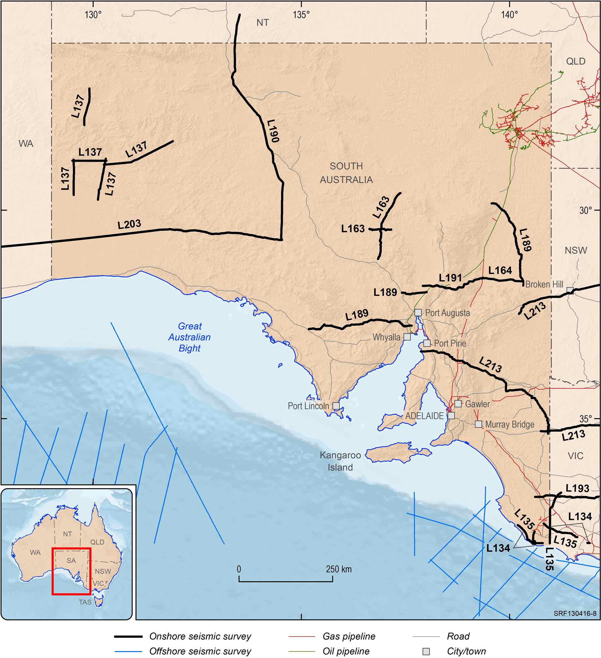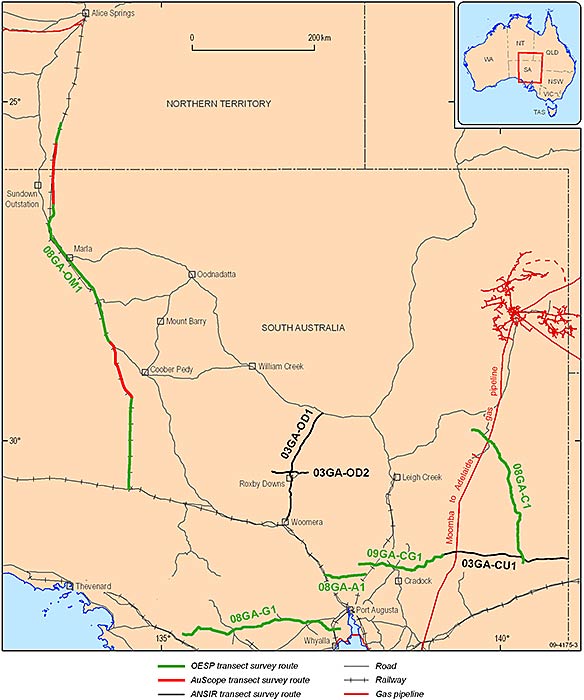 Geoscience Australia undertook acquisition of seismic reflection in South Australia as part of the OESP in June/July 2008. This survey consisted of three traverse lines, one across the Gawler province (08GA-G1, 253 kilometres), one across the Curnamona province (08GA-C1, 262 kilometres) and one in the Arrowie Basin (08GA-A1, 60.4 kilometres) (see Figure 12).