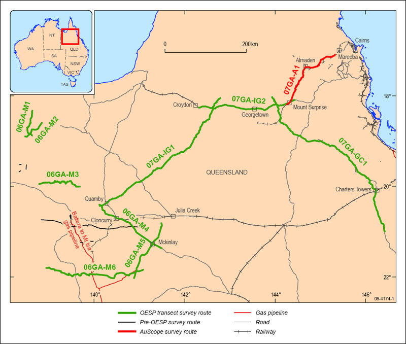 During May to October 2007 Geoscience Australia in collaboration with the Geological Survey of Queensland (GSA) contracted Terrex Seismic to undertake the Isa-Georgetown and the Georgetown-Charters Towers Deep Seismic Reflection Surveys. These surveys acquired 1200 kilometres of deep seismic reflection, gravity and magnetotelluric data along three traverses, 07GA-IG1, 07GA-IG2 and 07GA-GC1 (see Figure 9).