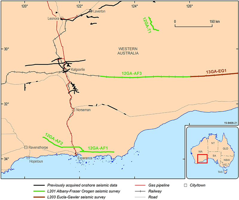 A 70 kilometre long deep crustal seismic line was also acquired near the Tropicana Gold mine with the assistance of AuScope Earth Imaging, Anglo Gold Ashanti and the Independence Group. The purpose of this line was to understand the structural geometry around the Tropicana gold deposit and help define prospective areas elsewhere along the belt. Raw data are available on request from clientservices@ga.gov.au