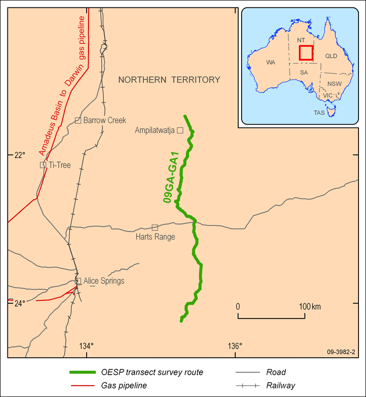 During June and July 2009, 373 kilometres of seismic reflection, MT and gravity data were acquired along a north-south trending traverse commencing in the Paleoproterozoic Davenport Province. The traverse then crossed the Georgina Basin, Arunta Inlier into the top of the Amadeus Basin (see Figure 11). The aim of the survey was to image fundamental controlling structures of basin development, and to shed light on deformation and fault reactivation expected from the Silurian to Carboniferous Alice Springs Orogeny. The raw seismic data is available on request from clientservices@ga.gov.au