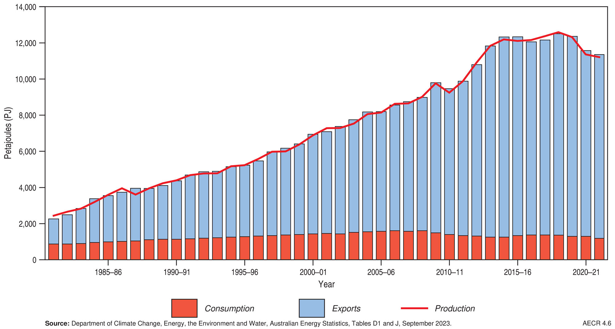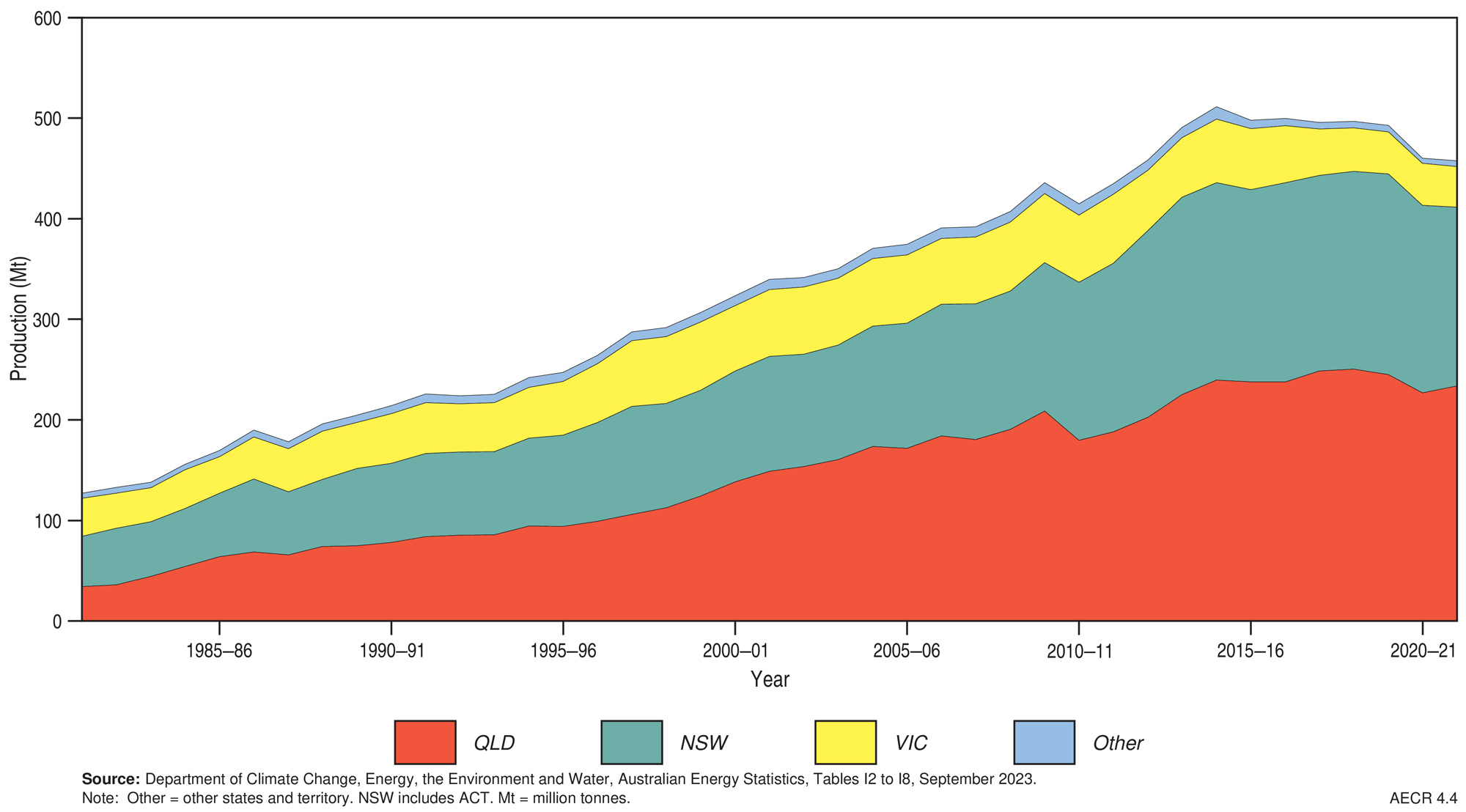 In 2022, Australia accounted for nearly 7% of coal production (black and brown), ranking fifth behind China (53%), India (9%), Indonesia (8%) and the United States (7%) (Energy Institute, 2023; Table 4.3).
