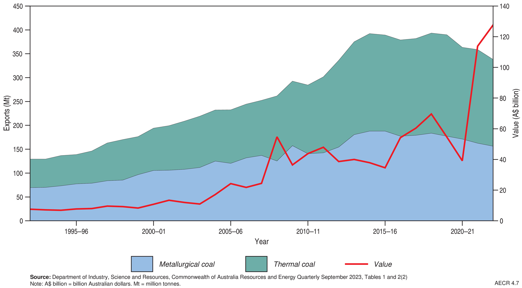 Australia exports the majority of its coal, capitalising on its abundant coal resources and strong ongoing coal demand from Asia. Australia exported 10,173 PJ of coal and coal products in 2021–22, which was about 57% of Australia’s total energy exports (including uranium exports; Department of Climate Change, Energy, the Environment and Water, 2023d). The total value of coal exports increased by an average rate of 9% per year from $38.6 billion in 2012–13 to $113.8 billion in 2021–22 (Figure 4.7).