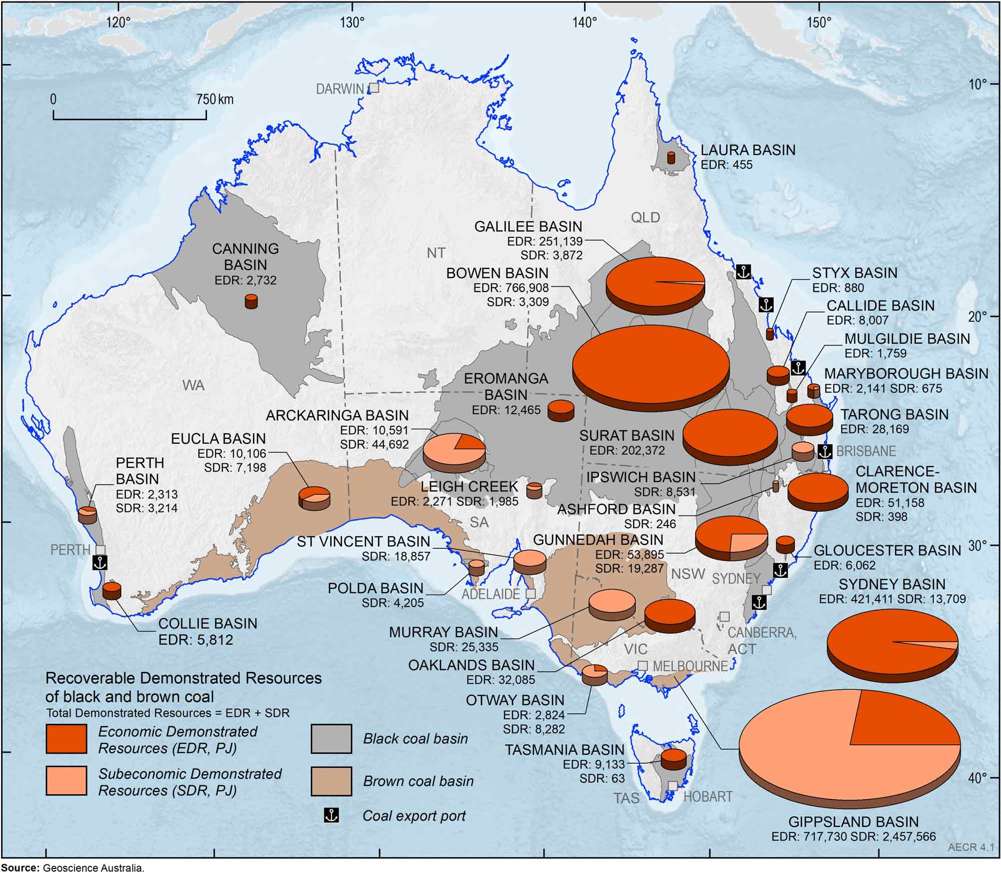 - Coal is Australia’s largest energy resource. As at December 2022, Australia’s recoverable Total Demonstrated Resources of black coal were estimated at 1,975,942 PJ (78,139 Mt). Recoverable Total Demonstrated Resource of brown coal were estimated at 3,247,899 PJ (331,424 Mt).