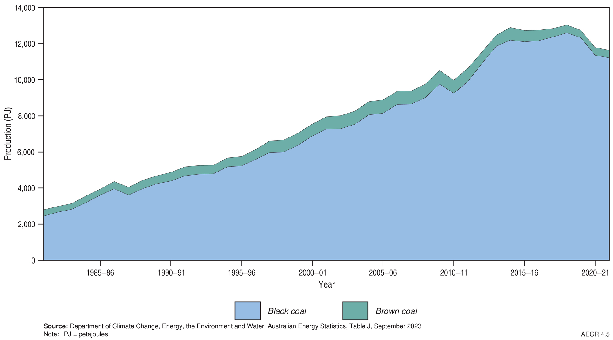 In 2021–22, Australia’s production of saleable black and brown coal was 11,631 PJ, which accounted for 55% of total energy production (including uranium production; Department of Climate Change, Energy, the Environment and Water 2023c). Over the past decade, coal production has increased by an average annual rate of 0.9%. This increase was moderated by falls in 2015–16, in 2019–20 due to the impact of COVID-19 on global demand, and in 2020-21 and 2021-22 coal production and export was affected by flooding and Chinese restrictions on Australian coal imports (Figure 4.5). In 2021–22, 90% of Australia’s black coal energy production was exported (Figure 4.6).