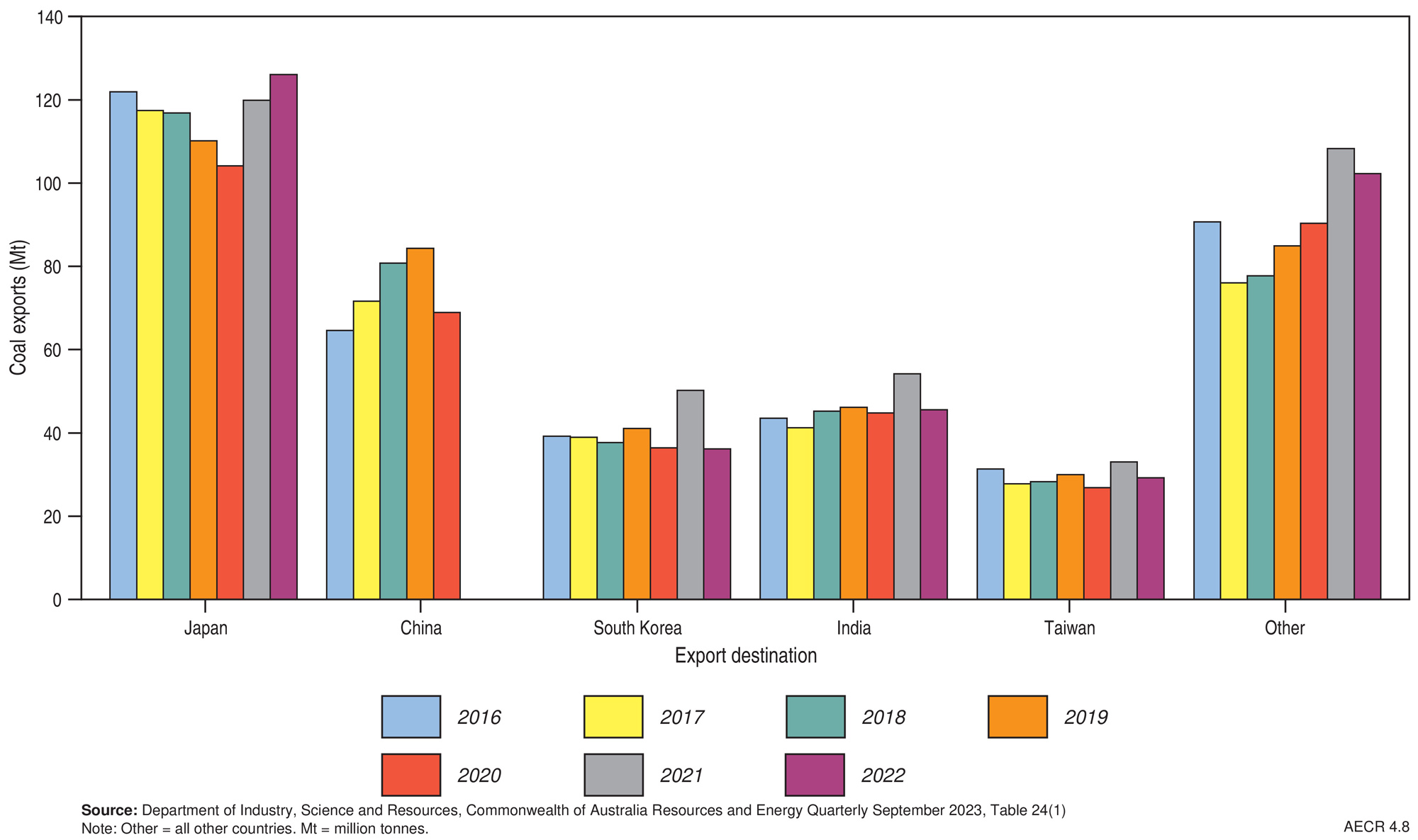 Coal exports to China were on hold in 2021–22, exports to Japan, South Korea and Taiwan increased and exports to India and other destinations remained relatively high (Figure 4.8). Coal export volumes have grown at an average annual rate of 1.8% from 302 Mt in 2011–12 to 359 Mt in 2021–22; however, in 2021–22 Australian coal production was constrained, and exports decreased during the year (Department of Industry, Science and Resources, 2023b). However, even though production was constrained, with global disruptions to production and supply chains, the average Newcastle thermal coal spot price increased to US$359/t in 2022, compared to US$135/t in 2021, and the Australian east coast premium hard coking coal spot price averaged US$364/t, compared to US$221/t in 2021 (Department of Industry, Science and Resources, 2023b).
