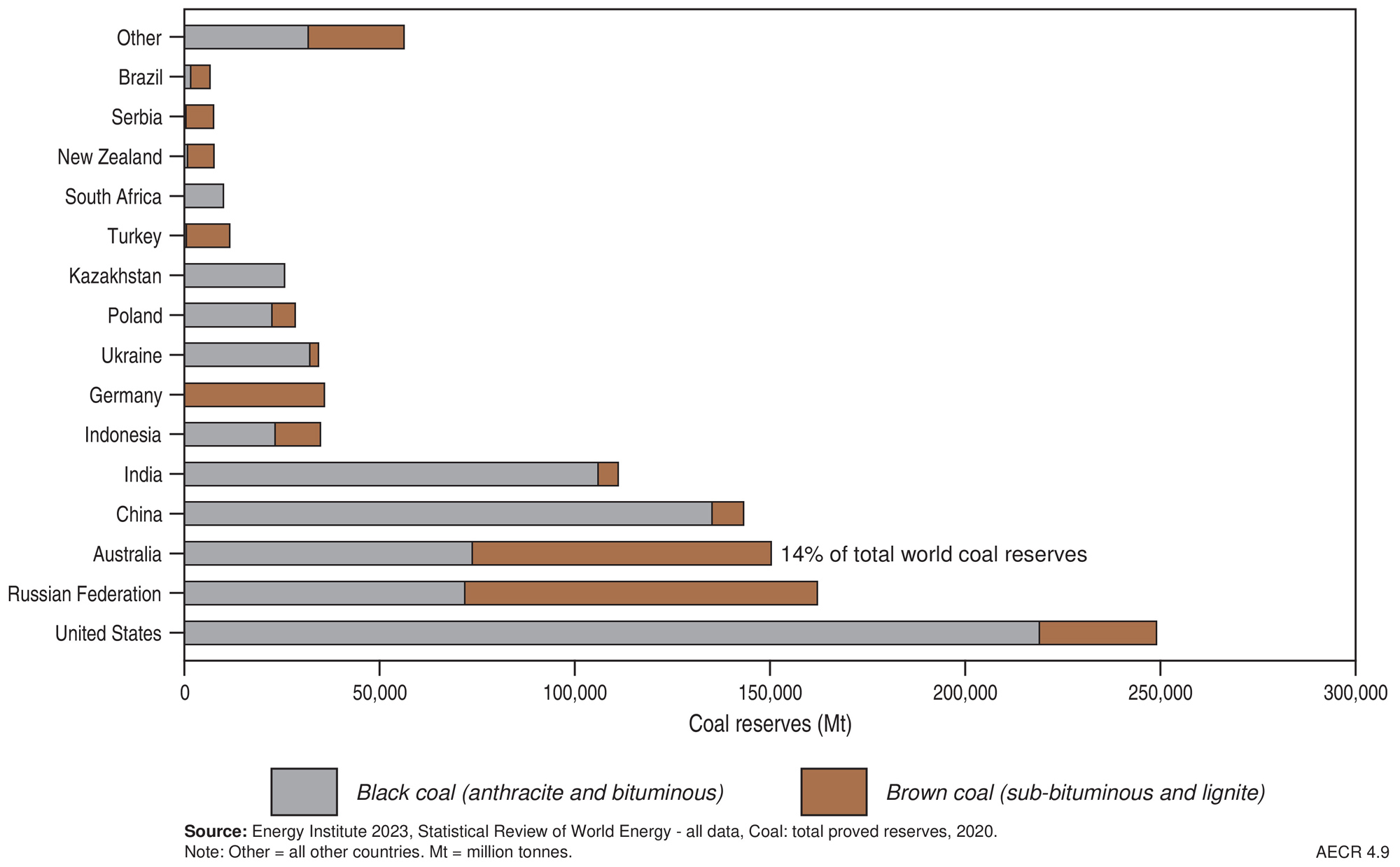 In 2020, Australia held 14% of the world’s coal reserves (black and brown), ranking third behind the United States (23%) and Russia (15%) (Energy Institute, 2023; Figure 4.9; Table 4.3).
