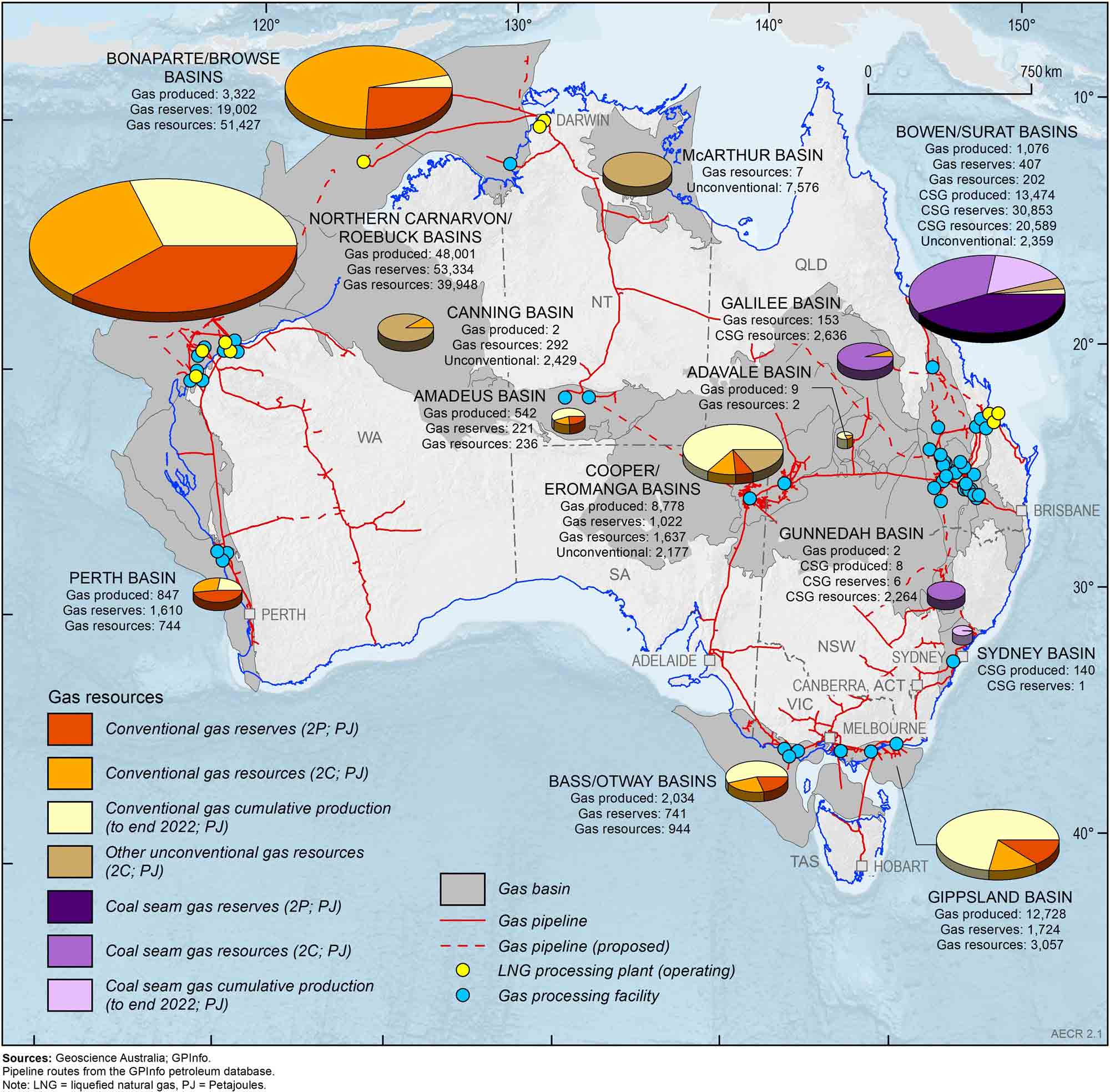 The majority of the remaining identified conventional gas resources occur in basins on Australia’s North West Shelf, while onshore basins in Queensland hold the greatest quantity of identified remaining coal seam gas resources. Other unconventional gas resources are located in onshore basins in the Northern Territory, Western Australia and Queensland (Figure 2.1, Table 2.1, Table 2.2, Table 2.3, Table 2.4).