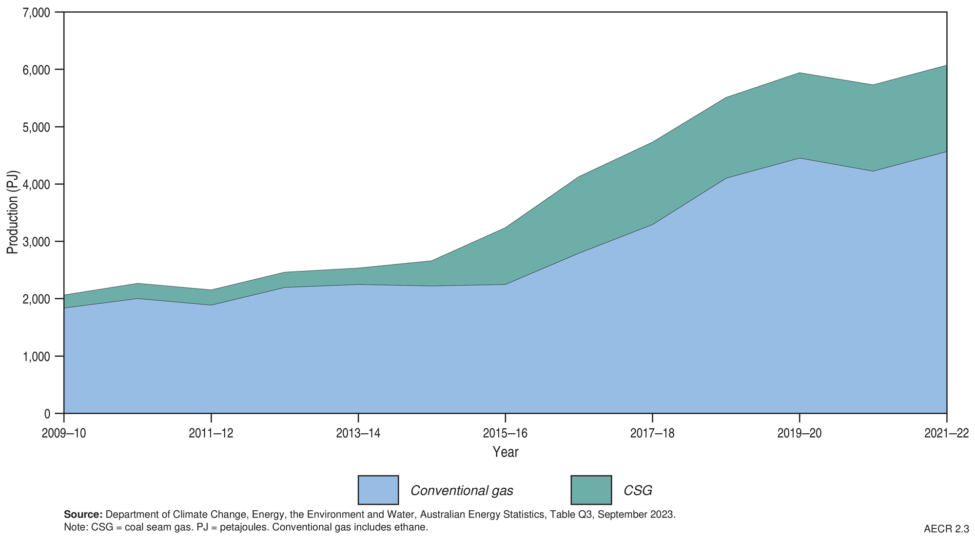 In 2021-22, conventional gas contributed 75% of Australian natural gas production on an energy content basis (Figure 2.3; DCCEEW, 2023). The remaining 25% of Australia’s gas was produced from CSG accumulations (Figure 2.3), representing more than 70% (1,507 PJ) of gas production in the east-coast region (DCCEEW, 2023).