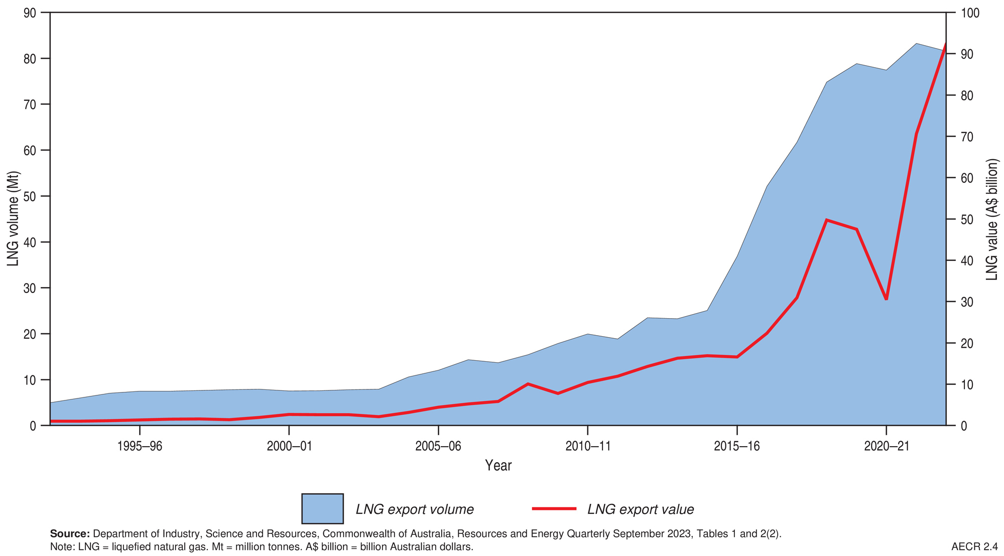 Australia is a substantial net exporter of natural gas, exporting about 70% of produced volumes as LNG in 2022 (Table 2.5). Over the past decade, LNG exports from Australia have increased by an average of 14% a year (Figure 2.4), with several new facilities commencing production during this period (DISR, 2024).