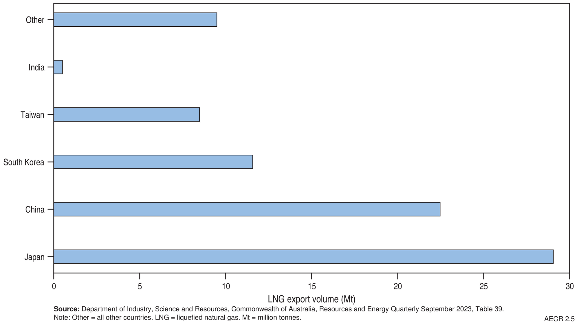 Nearly all of Australia’s LNG exports were delivered to Asian markets in 2022-23 (Figure 2.5), with Japan accounting for 36% (equivalent to 29.0 Mt), followed by China (28%, equivalent to 22.5 Mt), the Republic of Korea (14%, equivalent to 11.6 Mt), and Taiwan (10%, equivalent to 8.5 Mt; DISR, 2023).