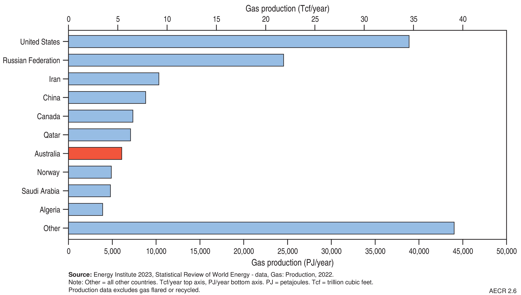 Energy Institute gas reserves data are Proved Reserves while Geoscience Australia data are Proved plus Probable (2P) Reserves. World reserve data in Table 2.5 are current as of 2020, whilst world production data are current as of 2022. Sources: aGeoscience Australia; bEnergy Institute (2023) Statistical Review of World Energy; cDepartment of Industry, Science, and Resources (2024) Resources and Energy Quarterly, March 2024 (Tables 16 and 17).