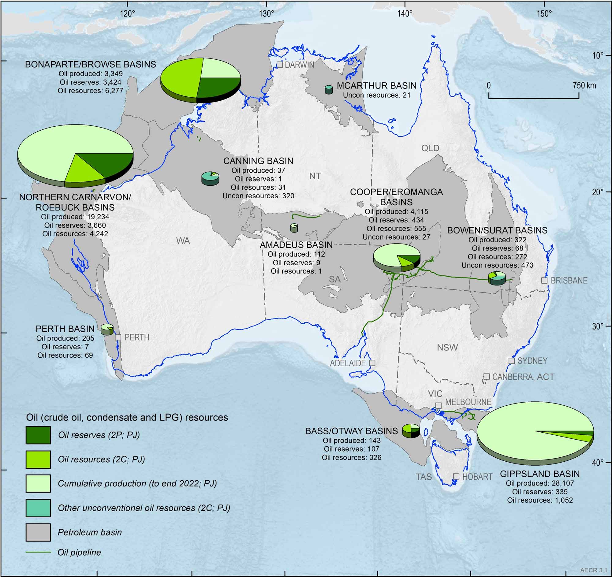 - In 2022, Australia’s conventional oil resources are estimated as 8,045 PJ (1,408 MMbbl) of proven and probable (2P) reserves and 12,826 PJ (2,229 MMbbl) of contingent (2C) resources. At 2022 production rates, this is equivalent to less than 12 years of remaining conventional oil reserves.