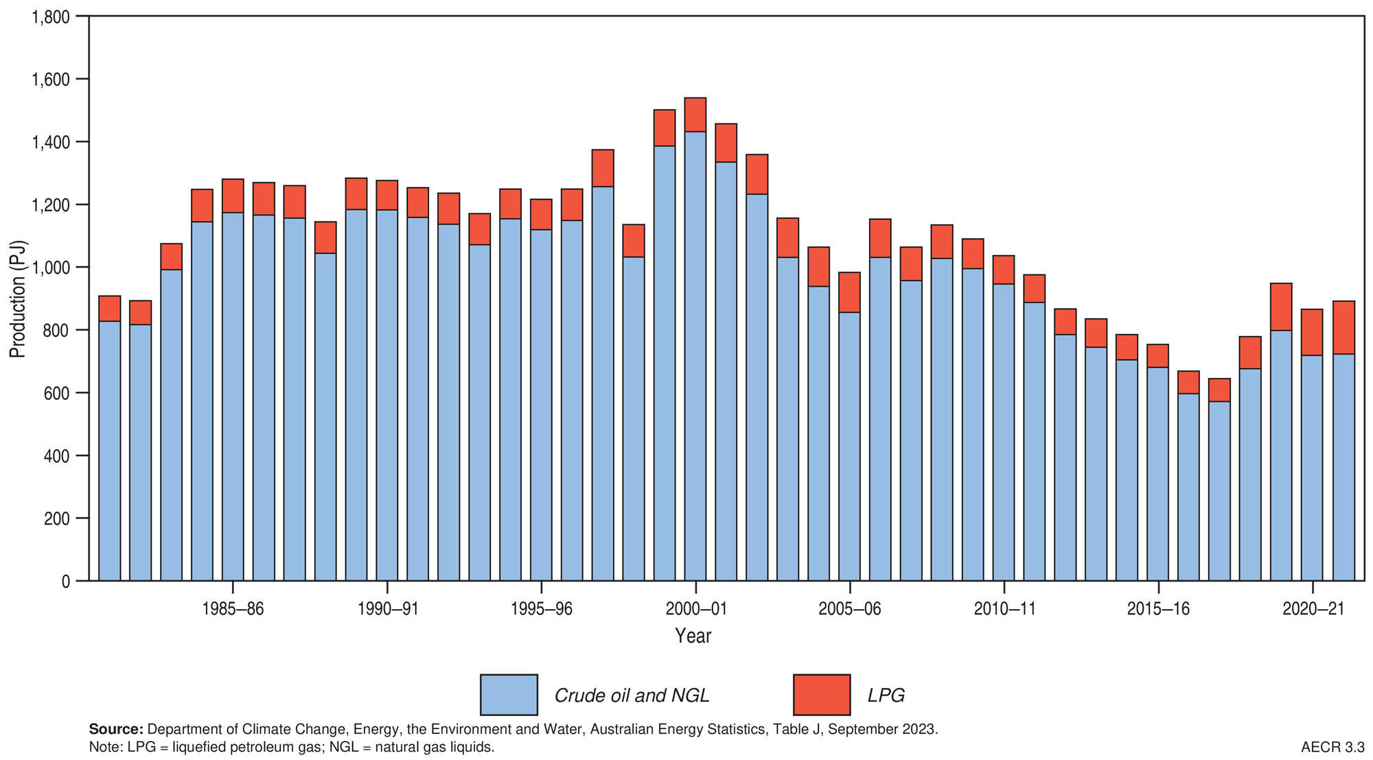 - In 2021-22 Australia produced 891 petajoules (PJ; 152 million barrels, MMbbl) of crude oil, condensate, and LPG, of which over 85% was exported. Australia’s domestic crude oil production continues to decline rapidly, and without new commercial discoveries, production is projected to cease within the next 6 years.