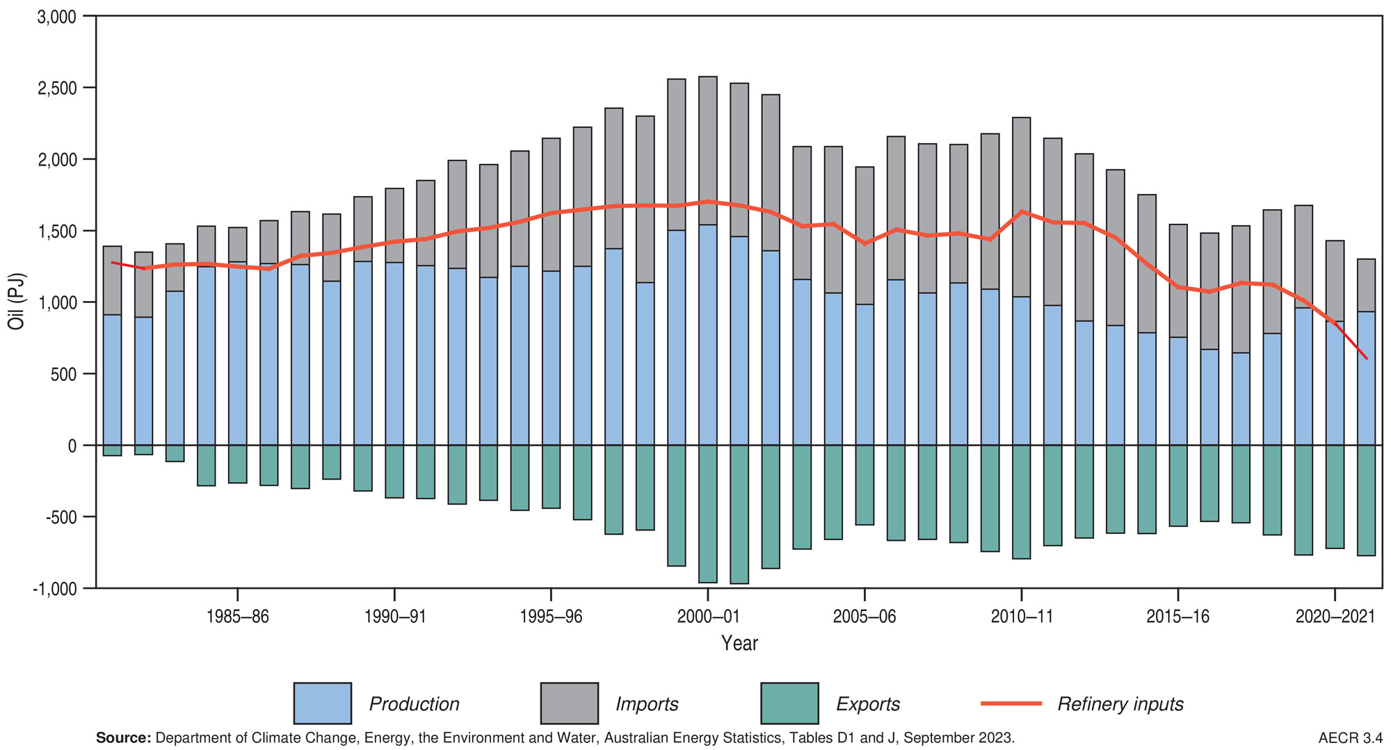 Since the mid-1980's Australia has been a net importer of refined oil products, as well as crude oil and other refinery feedstocks. However, Australia also exports a major share of its crude oil production, predominantly from Western Australia (Figure 3.4). Australia’s crude oil and condensate exports increased by 5% in 2021-22 to 623 PJ (DCCEEW, 2023a). Associated export earnings nearly doubled to AUD$14 billion, as oil prices recovered from the impact of COVID-19 and rose sharply following Russia’s invasion of Ukraine.