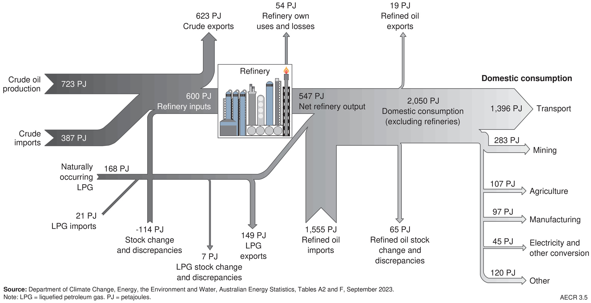 The majority of Australia’s energy imports are represented by refined petroleum products (including LPG) and crude oil (Figure 3.5). Australia’s imports of crude oil continued to decline, with a decrease of 29% (160 PJ) in 2021–22 to 387 PJ, largely due to the closure of two refineries in 2021: Kwinana in Western Australia in March, and Altona in Victoria in August. Meanwhile, imports of refined products and LPG were at the highest level on record, increasing by 17% to 1,575 PJ (DCCEEW, 2023a), in part to replace declining supply from domestic refineries.