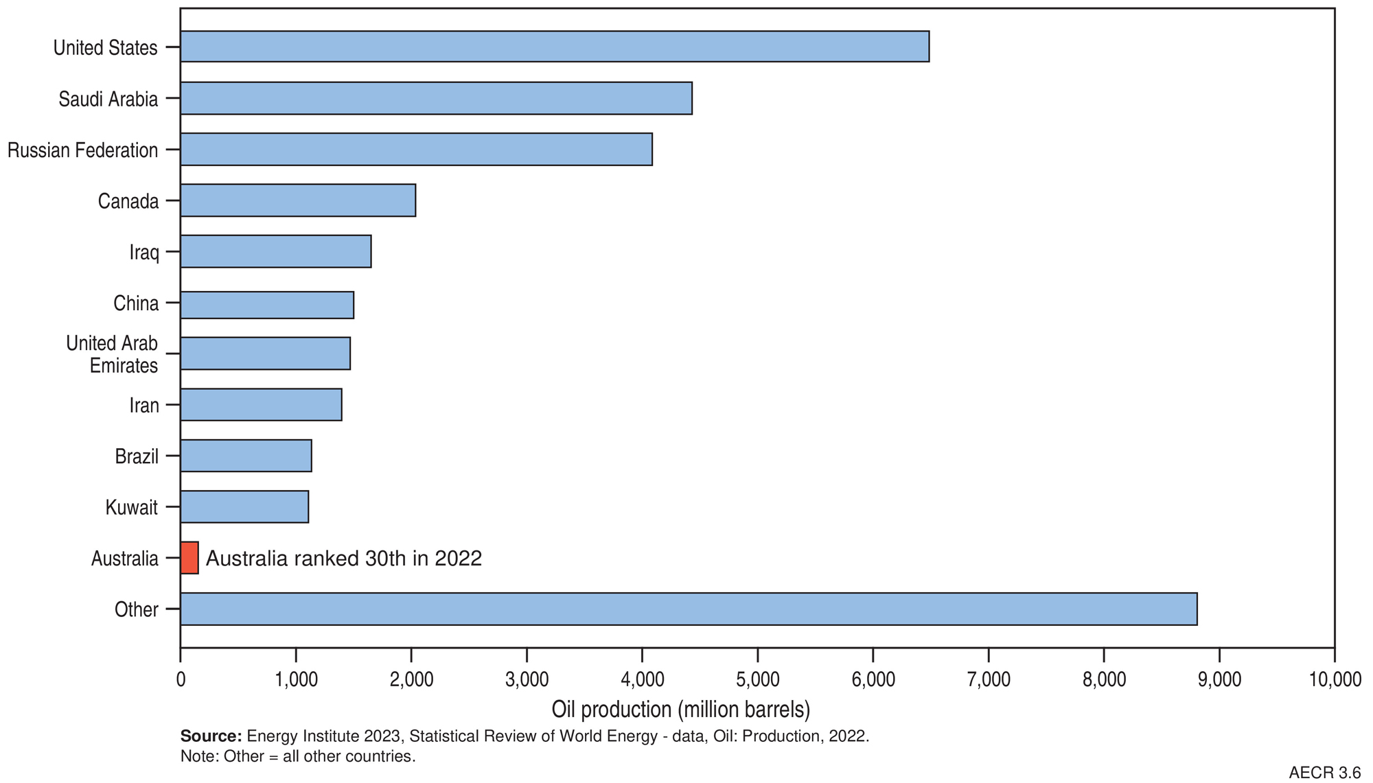In 2022, total world oil production was approximately 34 billion barrels (equivalent to ~210,664 PJ; Energy Institute, 2023). Volumetrically, the largest oil producers were in the Middle East, which held a 33% share of world production. The United States was the largest single producer, accounting for 19% of world production, followed by Saudi Arabia (13%) and the Russian Federation (12%; Figure 3.6). Australia is a minor oil producer, ranking 30th in the world and accounting for less than 0.5% of total oil production in 2022 (Energy Institute, 2023).