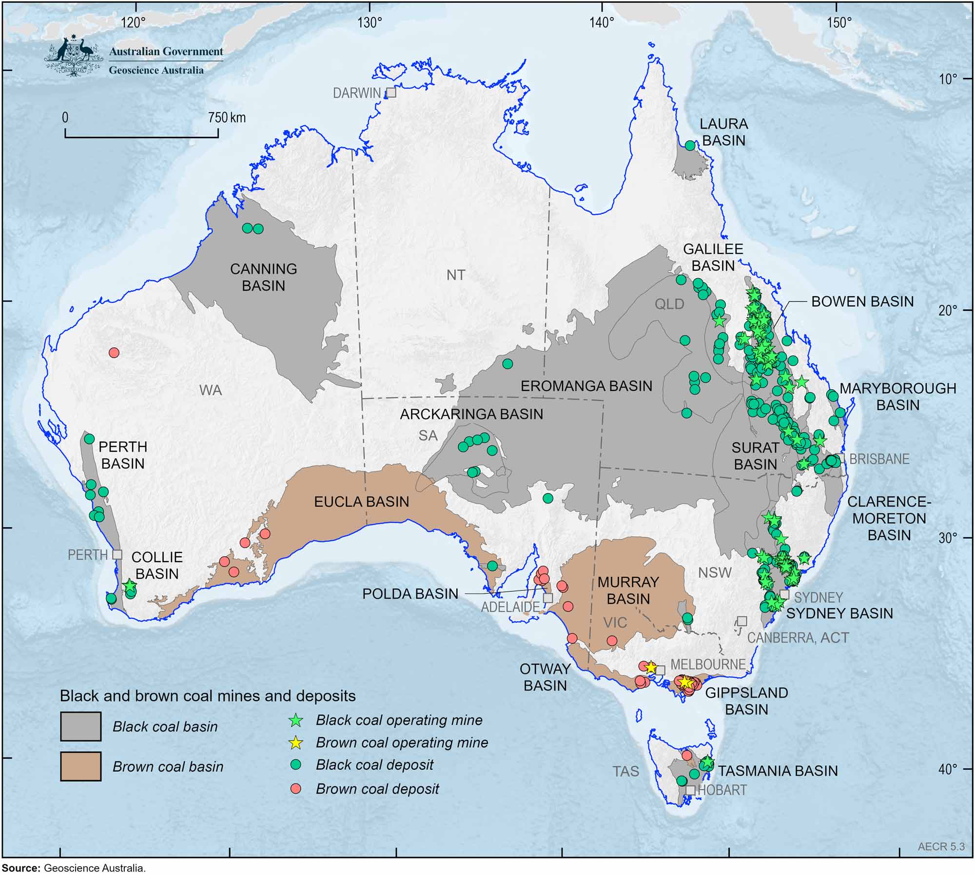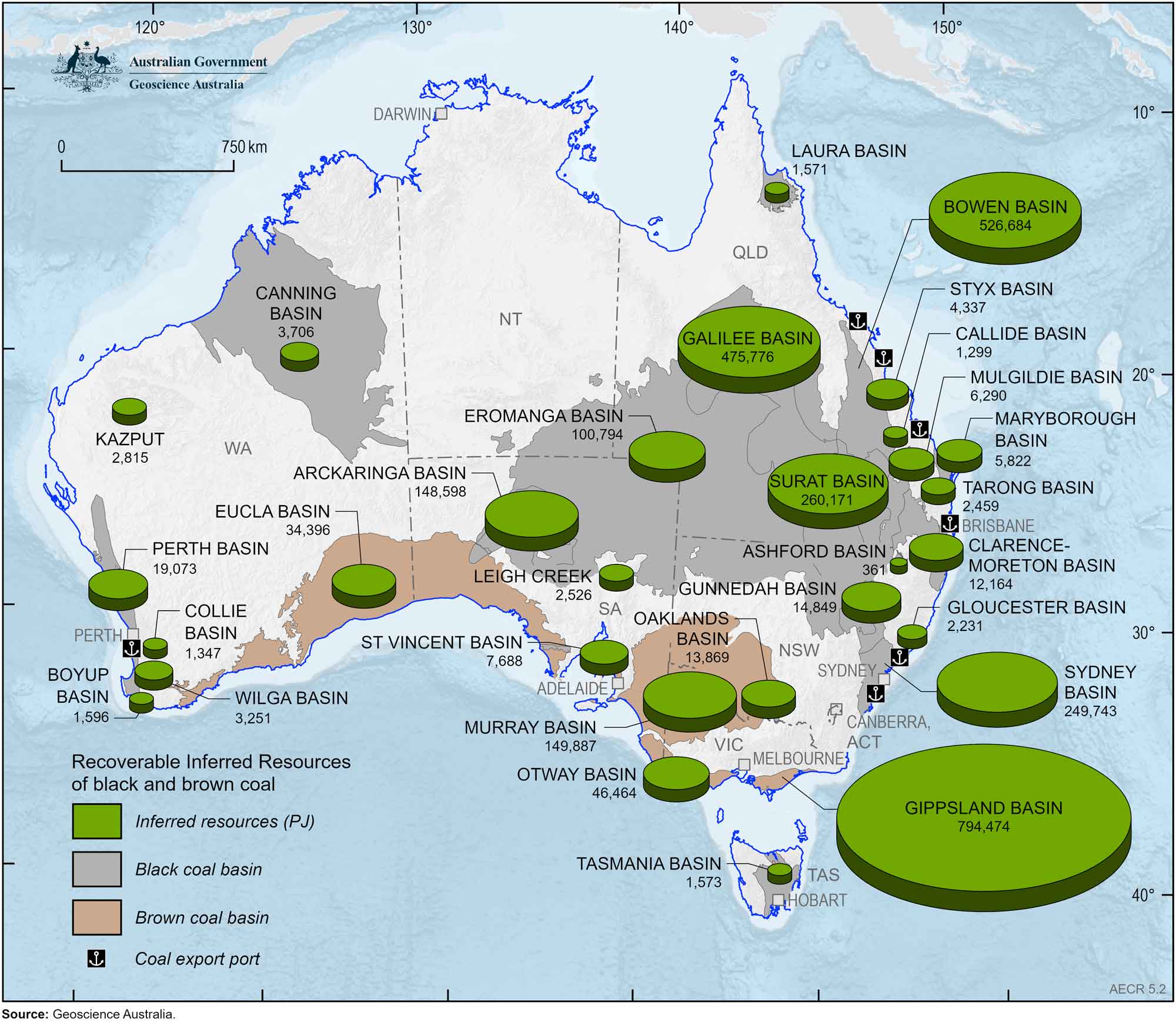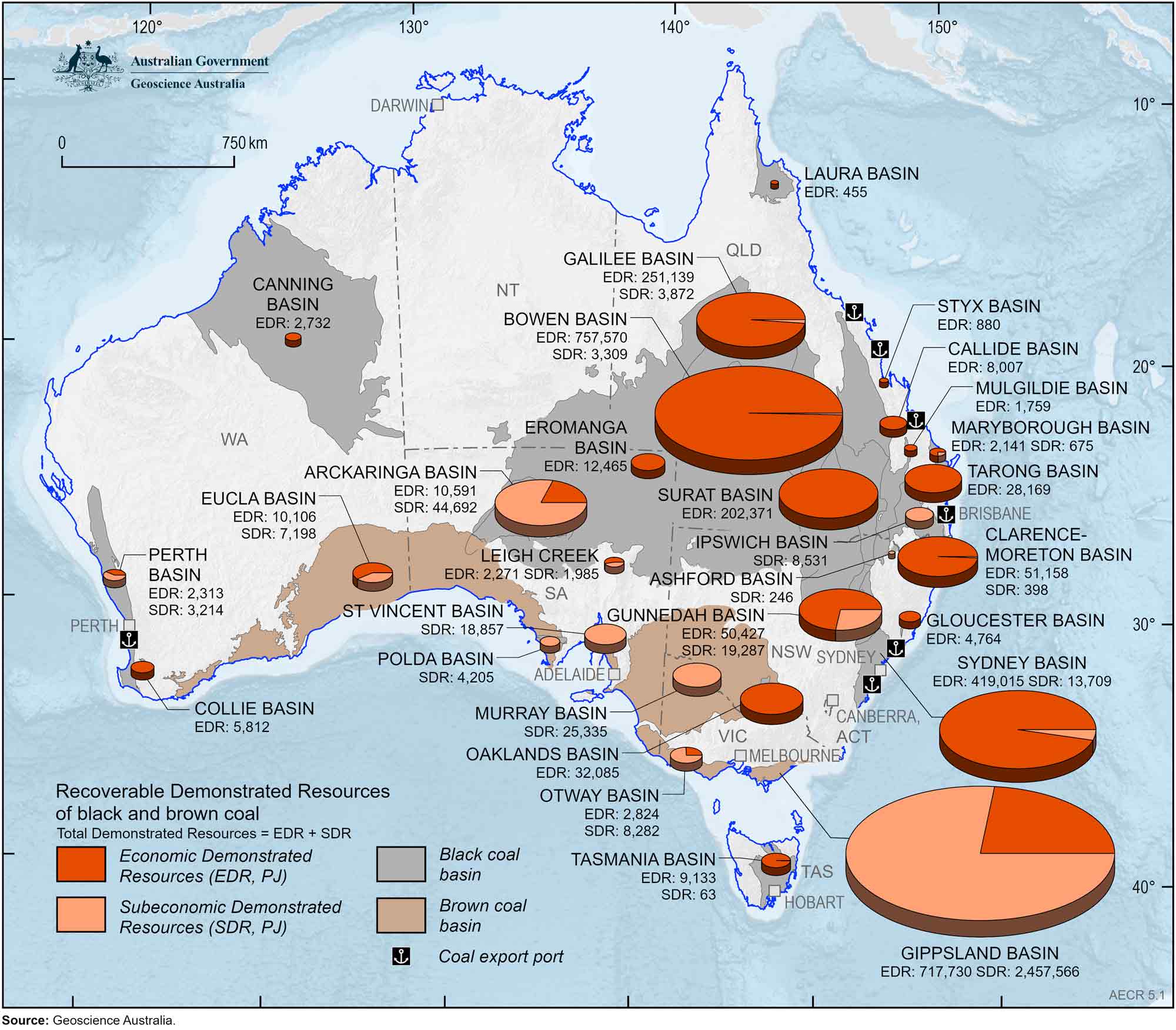 - Coal is Australia’s most significant energy resource. As of December 2023, Australia’s recoverable Total Demonstrated Resources of black coal were estimated at 1,959,440 PJ (77,750 Mt). Recoverable Total Demonstrated Resource of brown coal were estimated at 3,247,899 PJ (331,424 Mt).