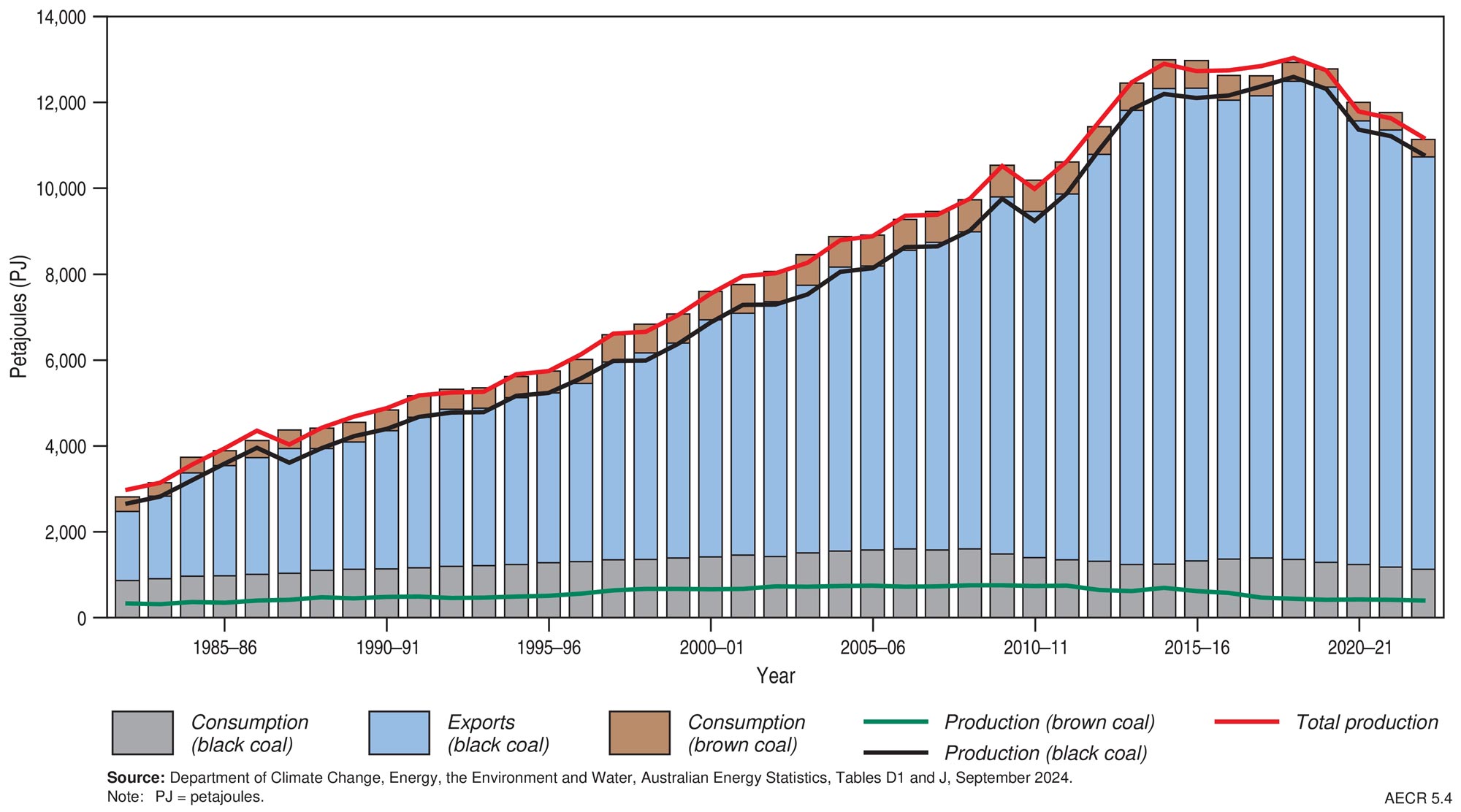 In 2022–23 Australia’s production of saleable black and brown coal was 11,184 PJ, which accounted for 54% of total energy production (including uranium production; DCCEEW, 2024). In 2022–23, 89% of Australia’s black coal energy production was exported (Figure 5.4).