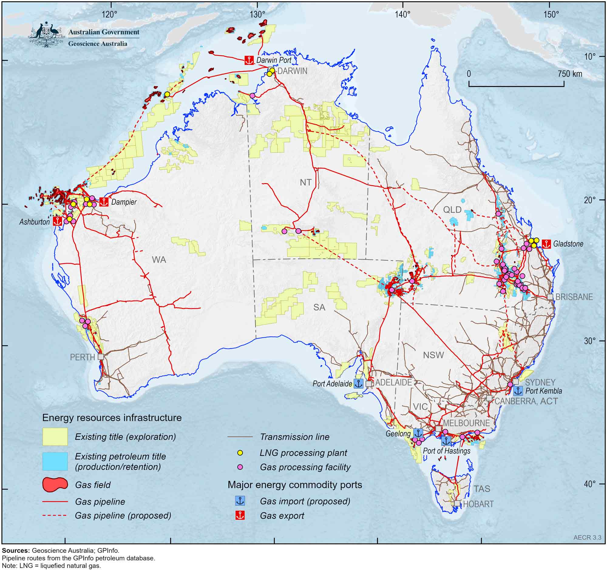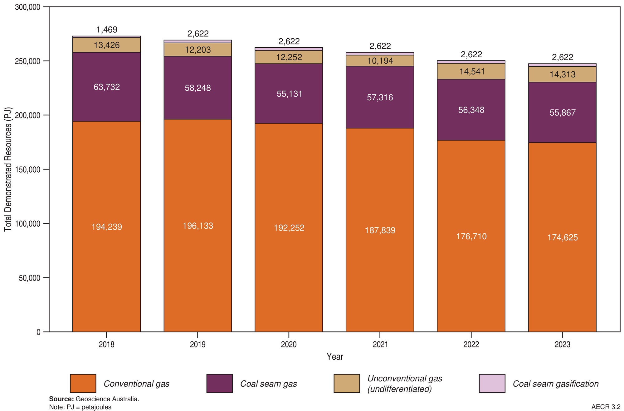 - Additional unconventional gas resources in Australia include tight gas, shale gas, basin-centred gas and in-situ coal gasification resources, which in 2023 totalled 16,935 PJ (15.06 Tcf; Table 3.3 and Table 3.4).