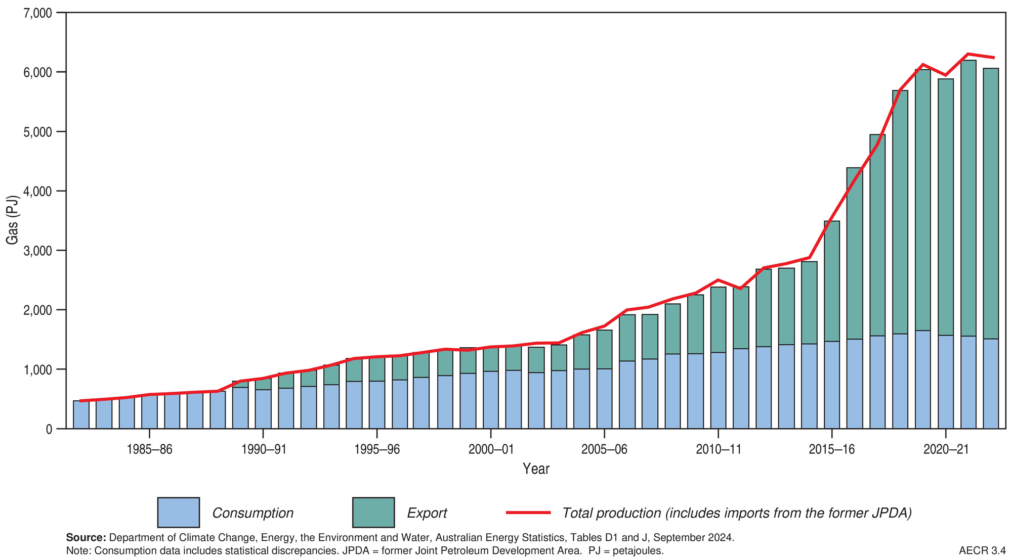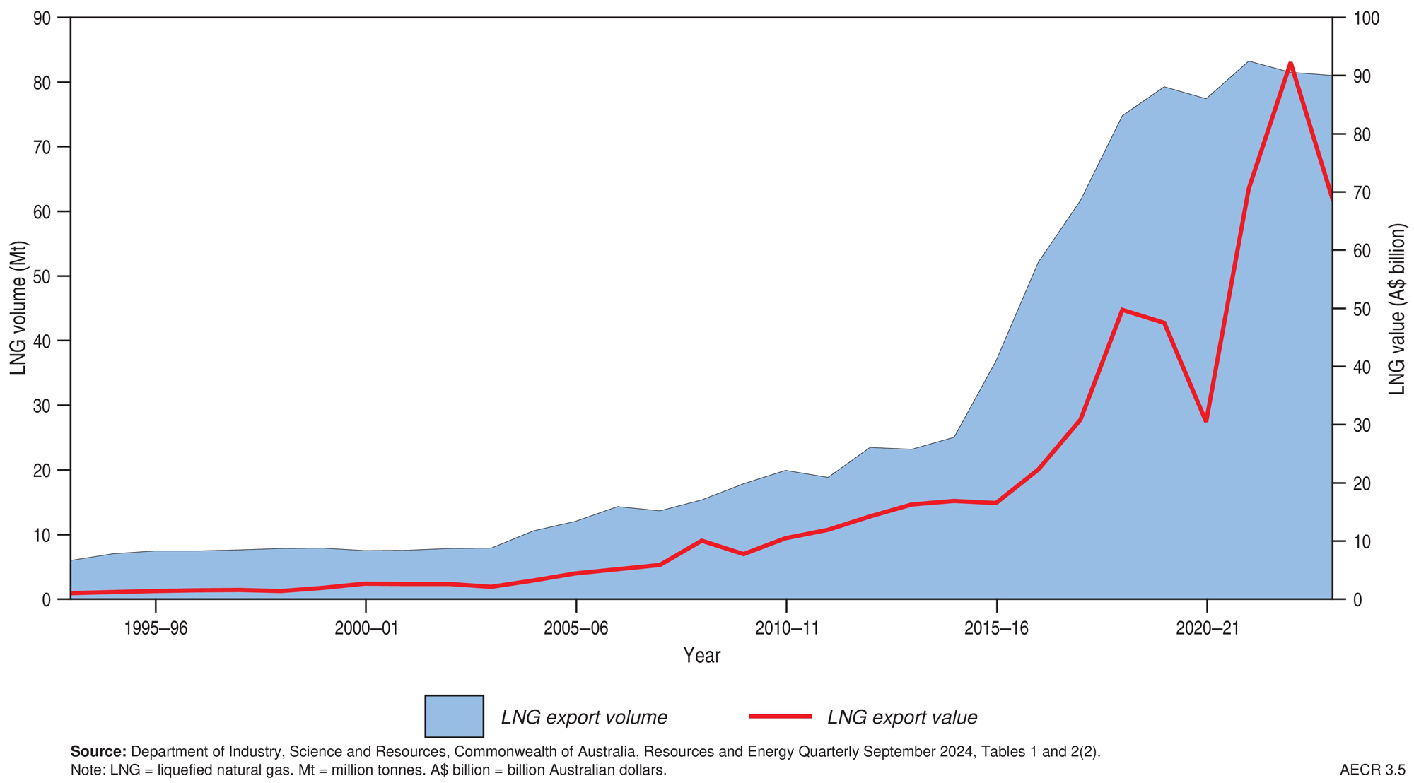 Australia is a substantial net exporter of natural gas, exporting about 70% of produced volumes as LNG in 2023. Over the past decade, LNG exports from Australia have increased by an average of 13.5% per year (Figure 3.4), with several new facilities commencing production during this period. After peaking in 2021-22 at 4,637 PJ (83.2 Mt), Australia’s LNG exports remained high in 2023 with 4,388 PJ (80.7 million tonnes, Mt) exported, slightly below the 4,427 PJ (81.4 Mt) exported in 2022, placing Australia as the world’s third largest LNG exporter. In 2023, Australia’s LNG export earnings reached $74.3 billion (Figure 3.5), down 18% from 2022 (DISR, 2024b). In 2023, Australia imported 44 PJ (0.8 Mt) of gas from Timor Leste that was produced in the former Joint Petroleum Development Area; this gas is liquefied in Darwin and exported (DISR, 2024b).