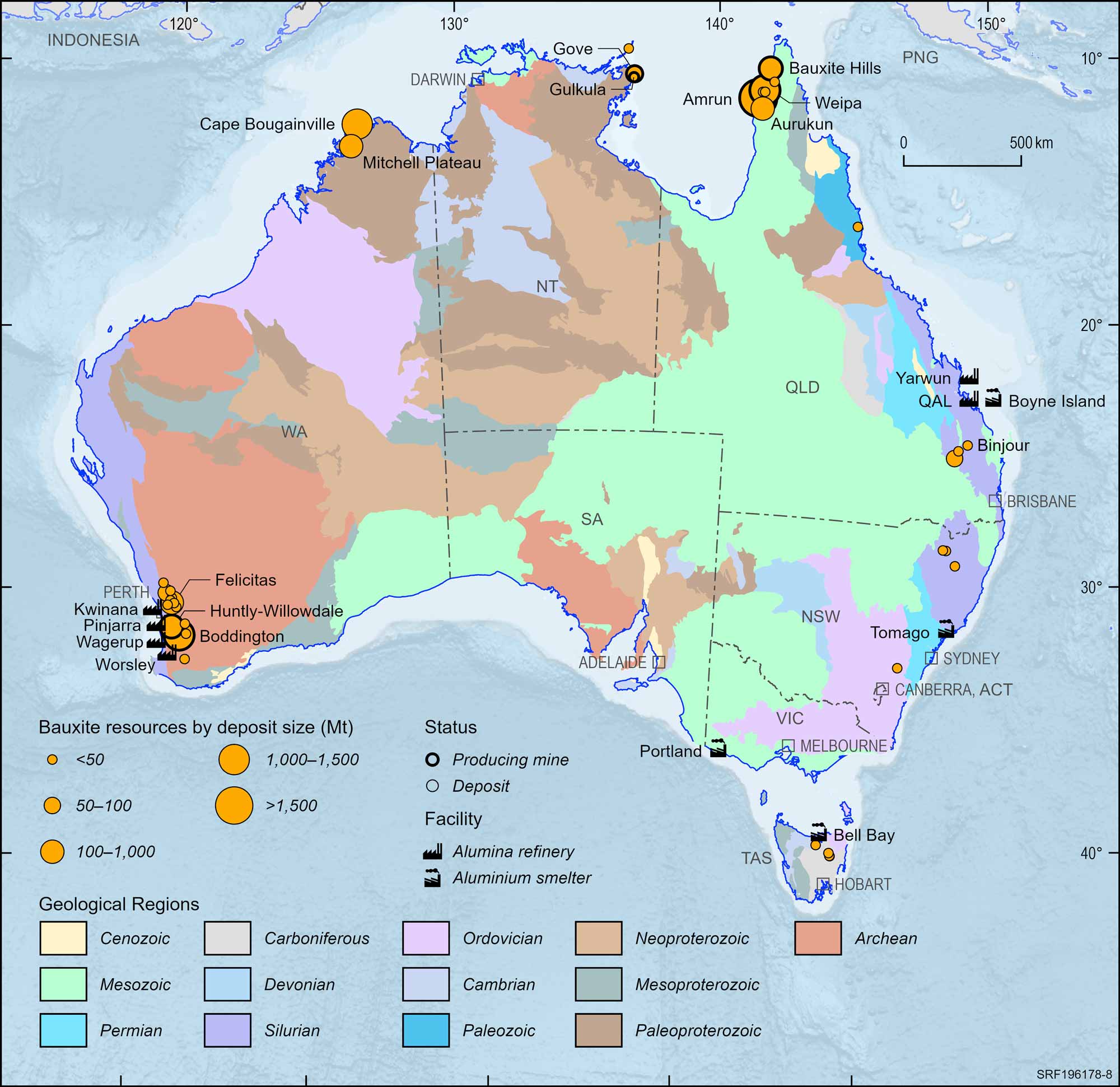 Resource figures are as at 31 December 2023. Operating mines and production are for calendar year 2023. Percentage increases and decreases and changes in the number of mines are in relation to 2022. World rankings are followed by percentage share in brackets. Export income is the sum of bauxite, alumina and aluminum categories, sourced from Office of the Chief Economist, Resources and Energy Quarterly, September 2024.