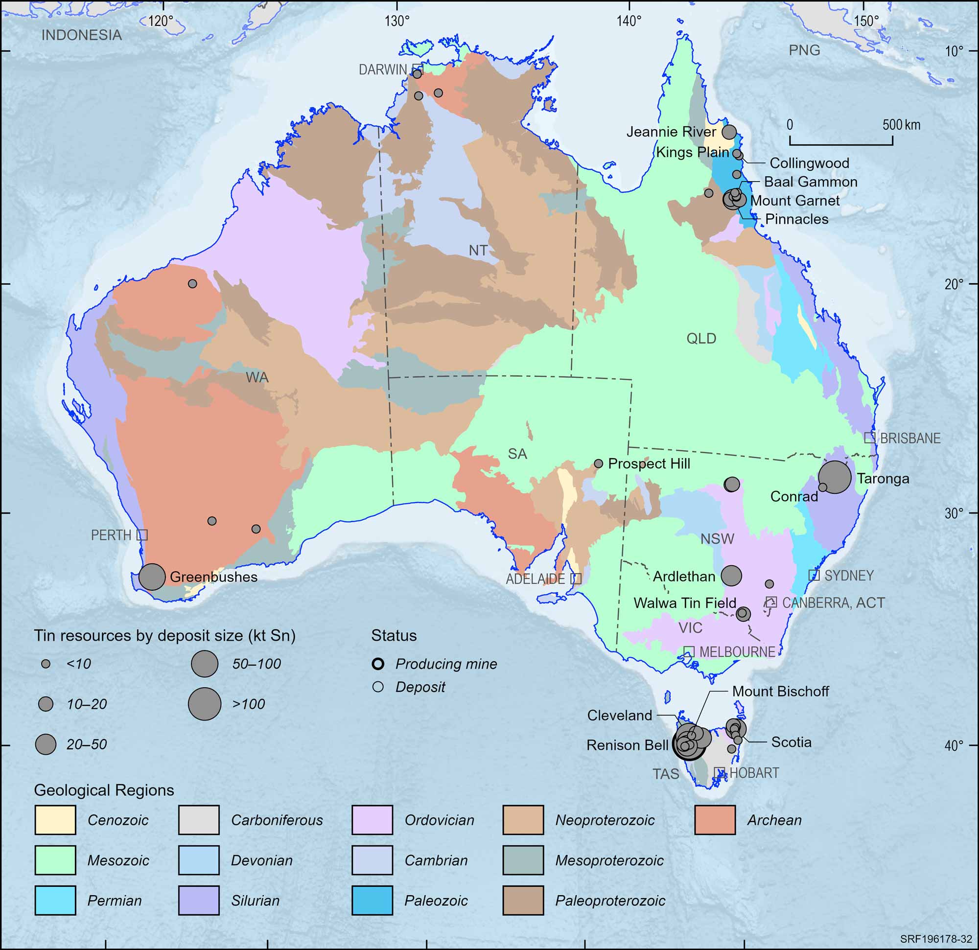 Resource figures are as at 31 December 2023. Operating mines and production are for calendar year 2023. Percentage increases and decreases and changes in the number of mines are in relation to 2022. World rankings are followed by percentage share in brackets. Export income is based on tin concentrate and sourced from Office of the Chief Economist, Resources and Energy Quarterly, September 2024.