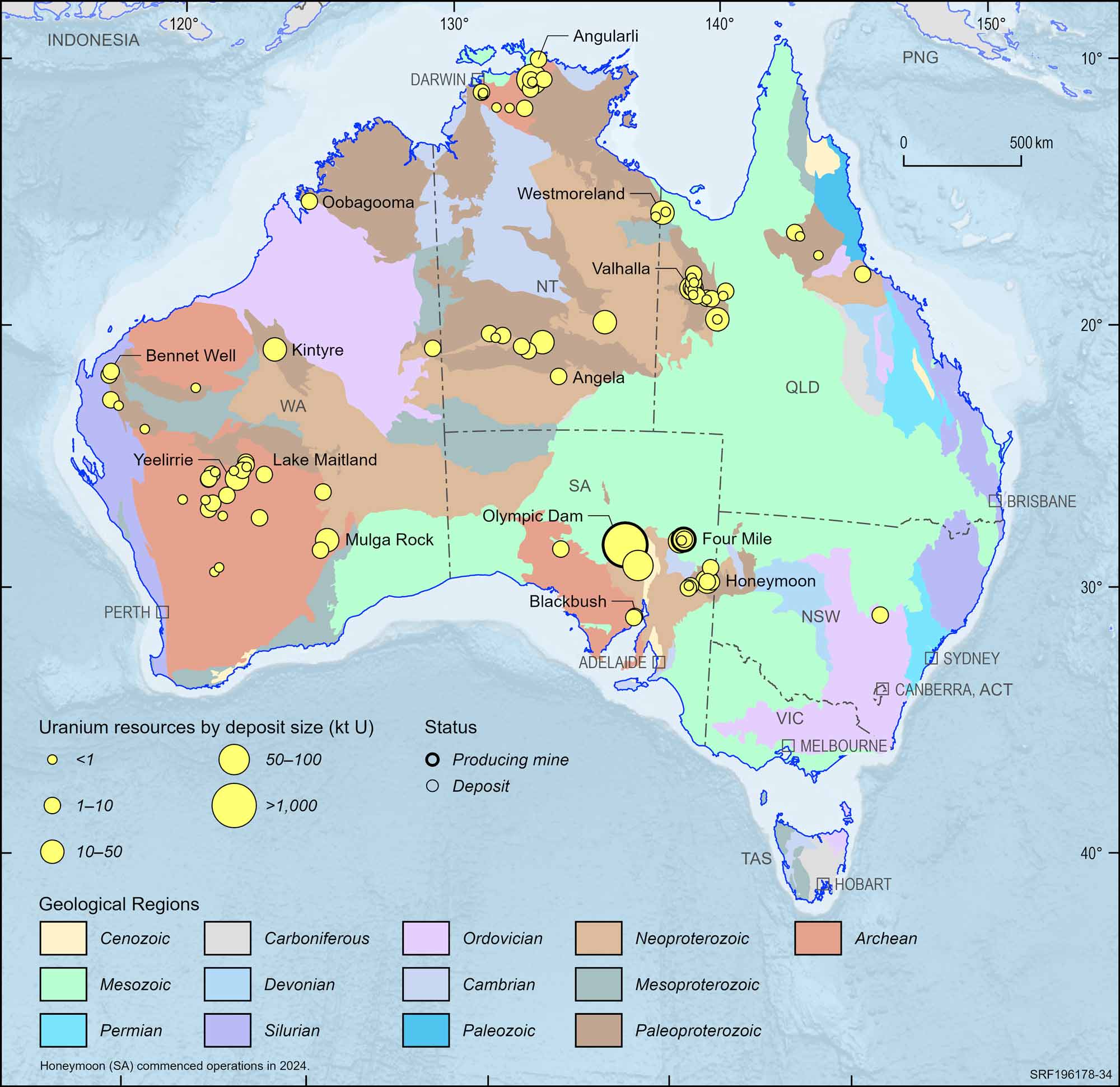 Resource figures are as at 31 December 2023. Operating mines and production are for calendar year 2023. Percentage increases and decreases and changes in the number of mines are in relation to 2022. World rankings are followed by percentage share in brackets. Export income is based on uranium oxide (U3O8) and sourced from Office of the Chief Economist, Resources and Energy Quarterly, September 2024.