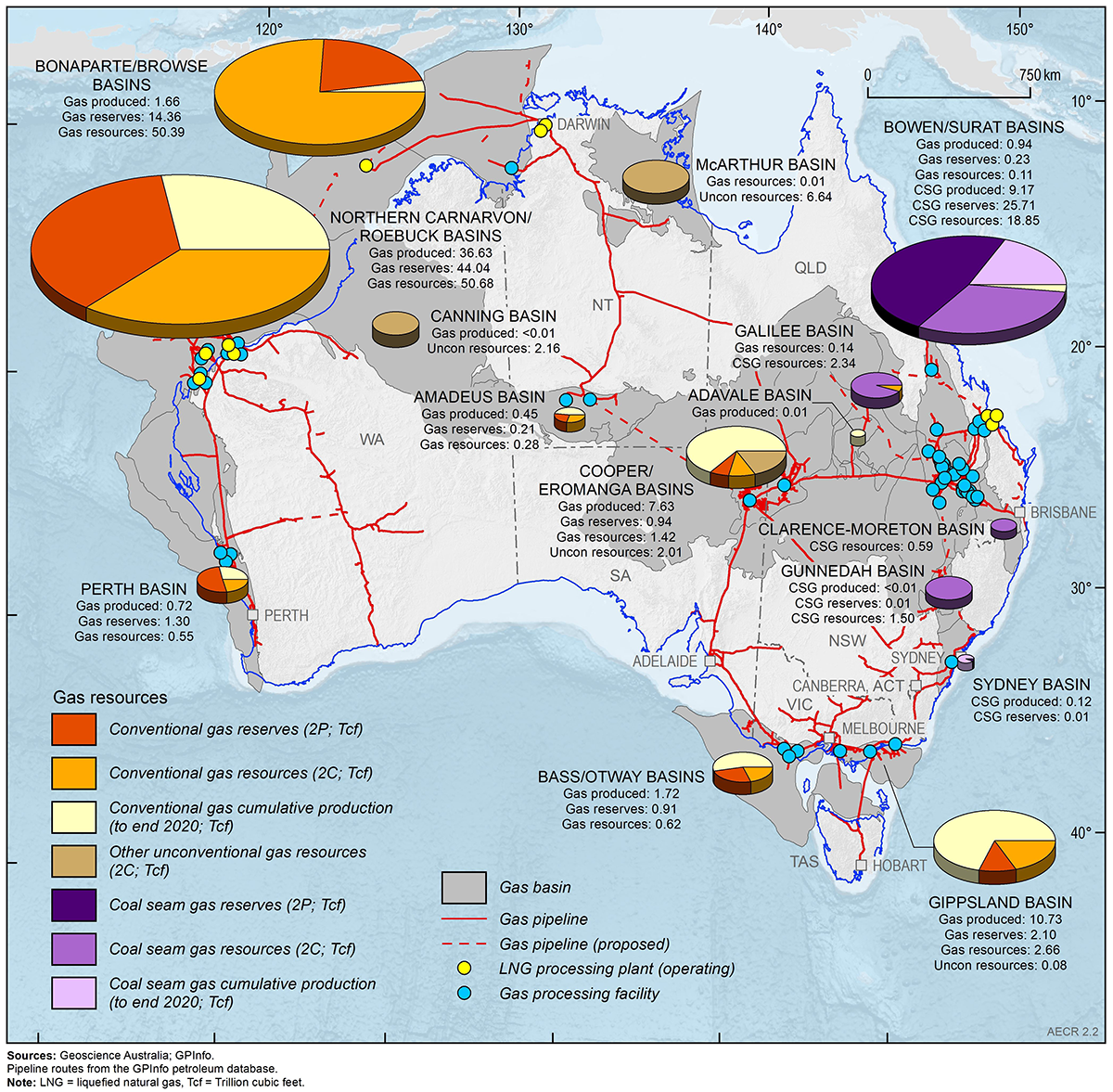 The 2020 resource estimates compiled for this report are based on publicly available onshore data aggregated with confidential offshore data submitted to the National Offshore Petroleum Titles Administrator (NOPTA). Offshore data are reported for calendar year 2020, while onshore data are based on government statistics and company estimates reported at various dates between June 2020 and June 2021. Where necessary, the data are aggregated for composite basin regions to de-identify confidential offshore field data in the custody of NOPTA. A bibliography of all open file data sources for onshore reserves, resources and production data are provided at the end of the chapter.