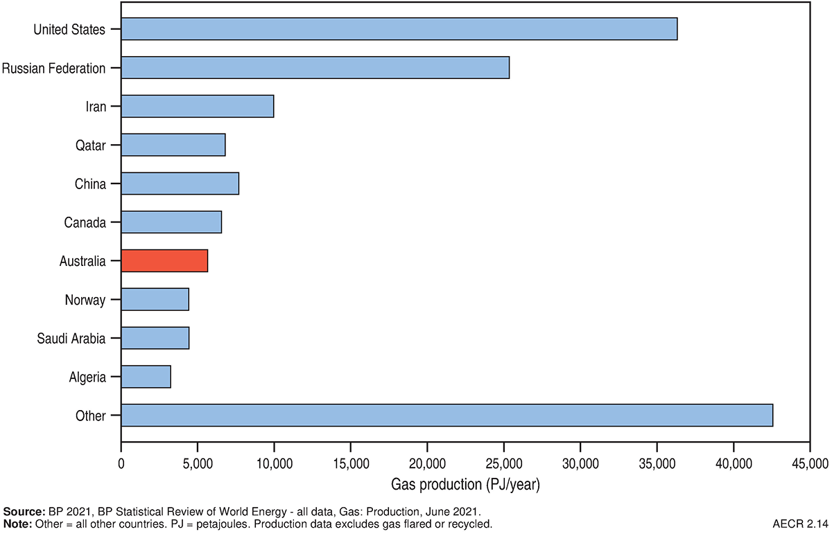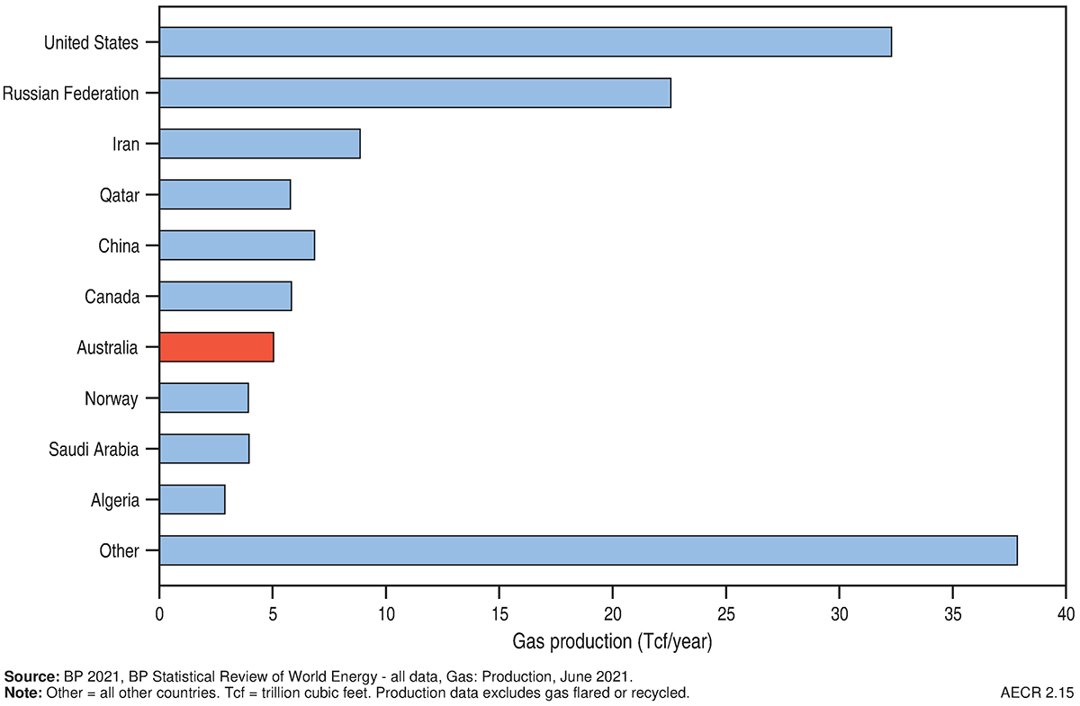 In 2020 world gas production decreased by 3.3 per cent to a total of 138,732 PJ (136 Tcf; bp, 2021). Approximately 40 per cent of production came from the US and Russia (Figure 9 and Figure 10). Australia ranked seventh in the world, accounting for 3.7 per cent of total gas production during this period (Table 5).