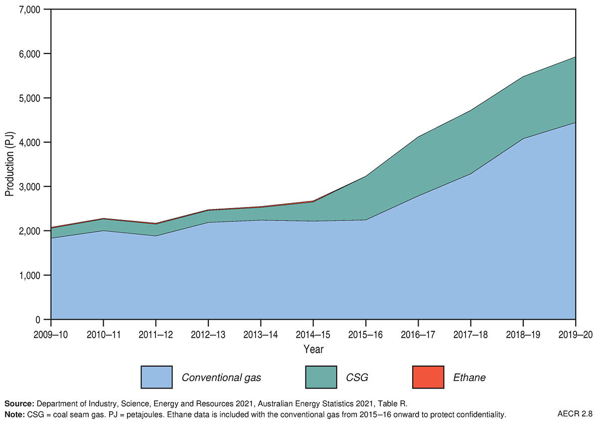 Conventional gas contributed 75 per cent of natural gas production on an energy content basis (Figure 5; Department of Industry, Science, Energy and Resources, 2021a). The significant production growth of CSG in recent years is attributable to the expansion of LNG production from three major CSG to LNG plants near Gladstone, Queensland (Queensland Curtis LNG, Gladstone LNG, and Australia Pacific LNG).