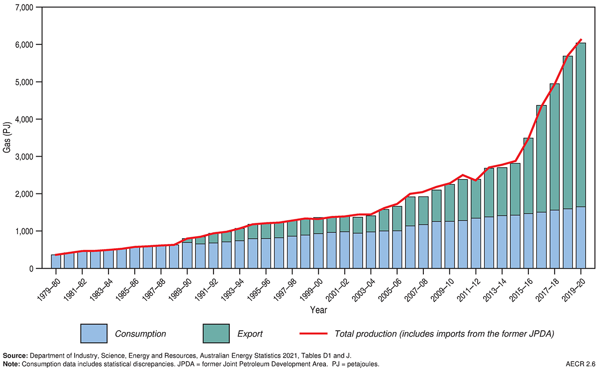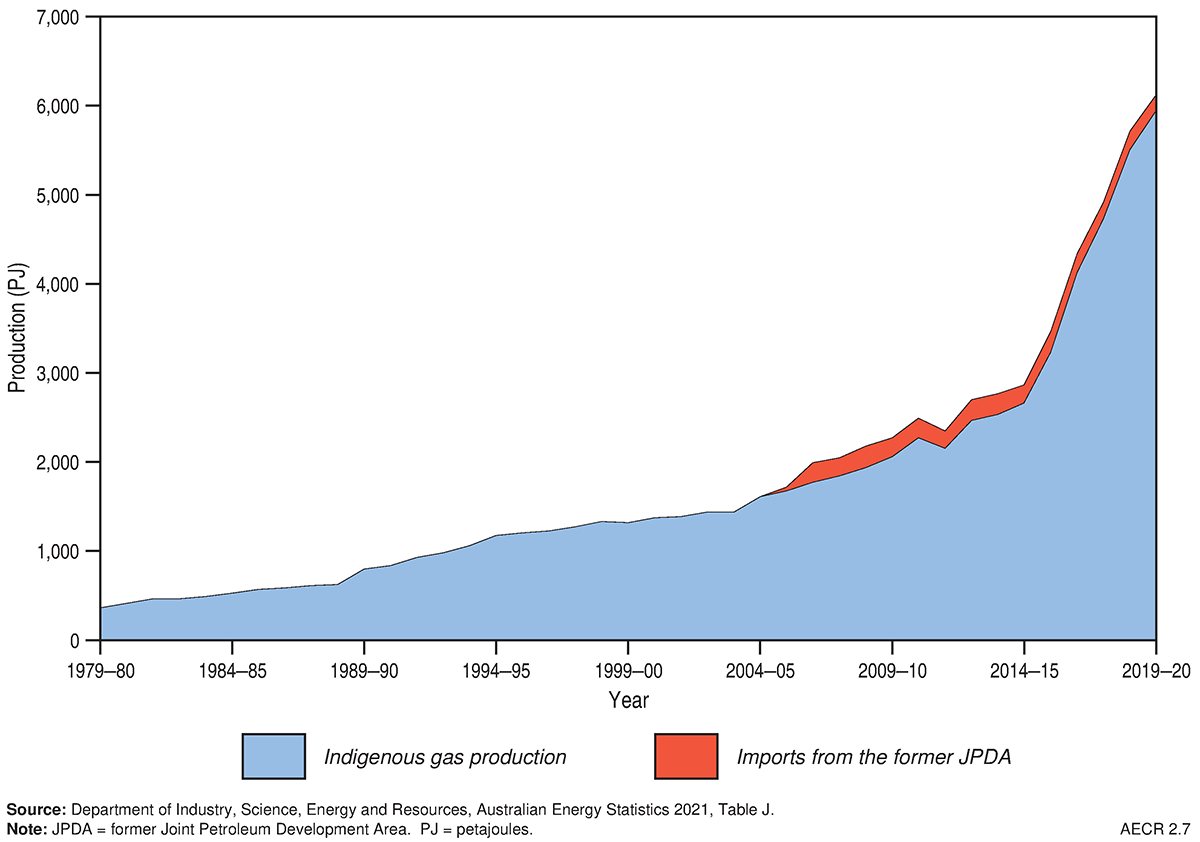 Recent trends in gas production are captured by the Australian Government’s energy production statistics in Australian Energy Statistics (Department of Industry, Science, Energy and Resources, 2021a). Natural gas production grew by 7.9 per cent to 5,945 PJ in the 2019–2020 financial year (Figure 5), and by an average of 11.2 per cent per year over the last decade (Department of Industry, Science, Energy and Resources, 2021a).