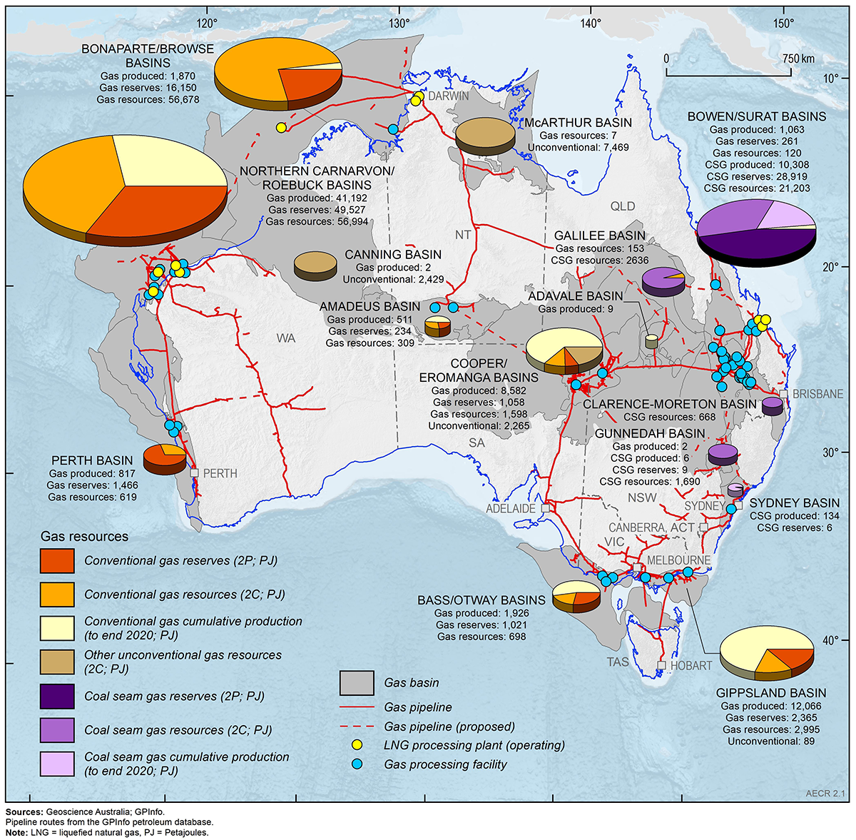 Notes: PJ= Petajoules. Data from the former Joint Petroleum Development Area (JPDA) have been omitted from Bonaparte Basin totals. Data Sources: Offshore data provided by NOPTA to year-end 2020; onshore data are sourced from government statistics and company estimates reported at various dates between December 2020 and June 2021.