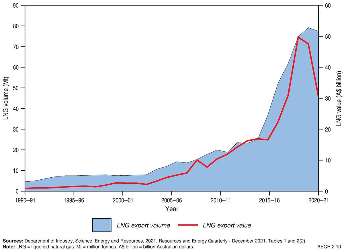 - During 2020 Australia was the seventh largest gas producer in the world and in 2021 Australia’s LNG exports reached a record high of 81.2 million tonnes (Mt) (slightly ahead of Qatar) making Australia the world’s largest LNG exporter.